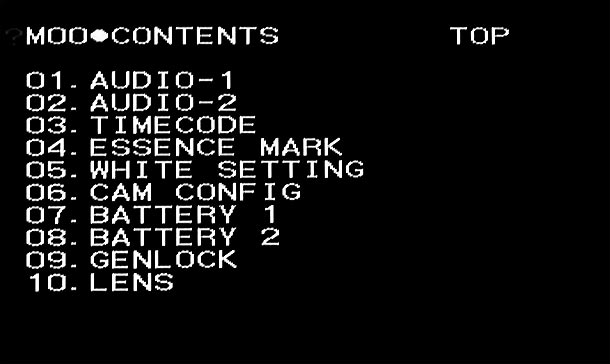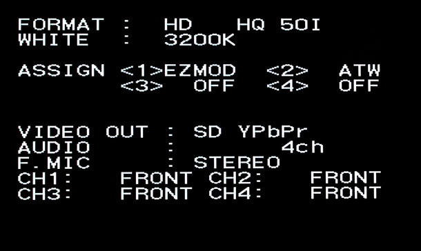 Im Ausklappschirm, im Sucher und auf Wunsch auch im ausgegebenen Bildsignal, zeigt der Camcorder Einstellmenüs und Statusinformationen an. Zusätzlich kann man auch den Timecode, Zebra, eine Mittenkreuz und eine Safe-Area-Markierung anzeigen.