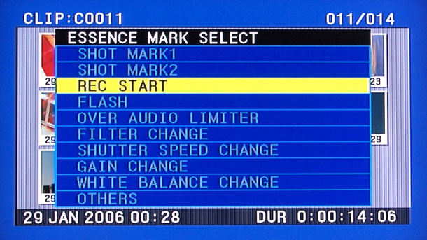 Die Disc-Aufzeichnung bringt viele neue Funktionen mit sich, die sich besonders in der weiteren Verarbeitung der Aufnahmen positiv auswirken können. Immer mehr Funktionalität wandert hierbei in der Produktionskette nach vorne, in den Camcorder. So bietet der F330 verschiedene Möglichkeiten, das Material zu loggen, zu sortieren und vorzuschneiden (mit Trimming-Funktion). Mit »Essence Marks« lassen sich etwa einzelne Clips in drei Kategorien markieren (Mark 1, Mark 2, ohne Markierung) — und das geht unter anderem auch mit der mitgelieferten Fernbedienung, sowohl während der Aufnahme, wie auch während der Wiedergabe. Die Clips können nach verschiedenen Kriterien auf Basis der Metadaten sortiert und ausgewählt werden, auch nach Kriterien wie etwa »Filter Change« womit sich Tageslicht- und Kunstlichtaufnahmen rasch separieren lassen.