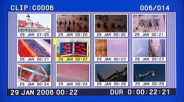 Jede gedrehte Einstellung wird beim F330 als separater Clip mit Metadaten gespeichert. Gleichzeitig mit der Aufzeichnung in der jeweils eingestellten Bildqualität, wird auf die Scheibe auch jeweils ein Proxy geschrieben: eine Low-Res-Kopie jedes einzelnen Clips (als MPEG-4-File mit 1,5 Mbps Videodatenrate und 64 kbps Audio pro Kanal). Drückt man den Thumbnail-Knopf des Camcorders wird jeder Clip mit einem Indexbild auf dem LCD-Schirm angezeigt. Über das integrierte Jograd oder mit der Fernbedienung kann man die Clip-Darstellung durchblättern und einzelne Clips zur Wiedergabe aufrufen.