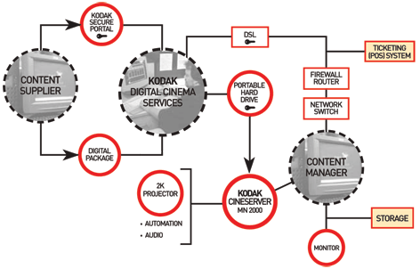 Kodak hat seinen Ansatz für ein solches System in Zusammenarbeit mit National CineMedia entwickelt, der gemeinsamen Vertriebs- und Marketing-Gesellschaft der drei größten US-amerikanischen Kinoketten, die insgesamt mehr als 1.100 Kinos mit mehr als 13.500 Leinwänden repräsentieren. Gleichzeitig weist Kodak auf die umfangreiche Markterfahrung des Unternehmens hin, die man bei der Installation von bislang rund 2.200 digitalen Pre-Show- und Feature-Systemen in den USA, Kanada, Australien, Singapur und Japan gesammelt habe.
