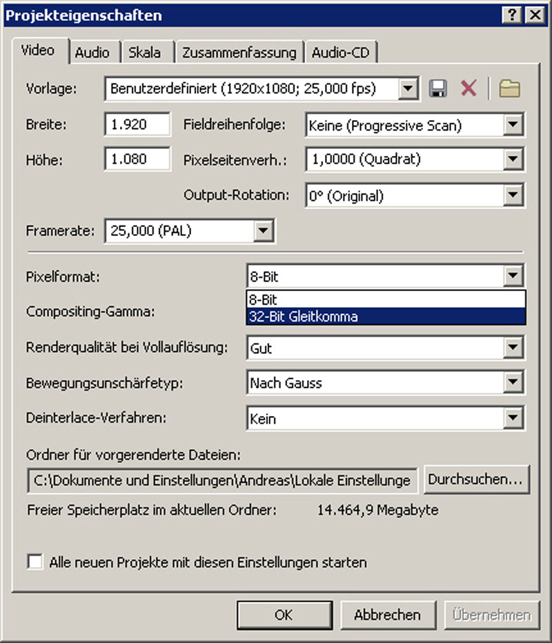 Auf den ersten Blick und für SD-Produktionen vielleicht nicht so wichtig, ist die einstellbare 32-Bit-Fließkomma-Videoverarbeitung. Für eine HD-Produktion stellt sie aber eine große Verbesserung dar. Beim Test mit HD-Grafiken ließ sich das Banding bei animierten Verläufen damit deutlich reduzieren. Allerdings dauert das Rendering dann auch etwa doppelt so lange wie bei 8-Bit-Verarbeitung.