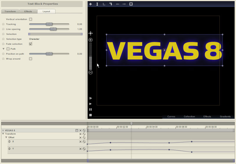 Öffnet man das Programm so fällt als erstes auf, dass in Vegas nun die Timeline unten und die Viewer sowie Material- und Effektauswahlfenster oben angeordnet sind – so wie sich das bei den meisten anderen Editing-Programmen schon lange verhält. Diese Anordnung der einzelnen Bedienmodule konnte sich der Nutzer zwar auch schon in der vorangegangenen Version einrichten, aber nun sieht die Oberfläche schon in der Grundeinstellung so aus. Eines der wichtigsten neuen Features ist der ProType Titler, der zu dem schon vorhandenen Standard-Titler hinzugekommen ist. Mit ihm lassen sich jeweils für Absatz, Wort und sogar einzelne Zeichen verschiedenste Parameter wie Position, Schatten, Glow, Unschärfe und Füllung festlegen und animieren.