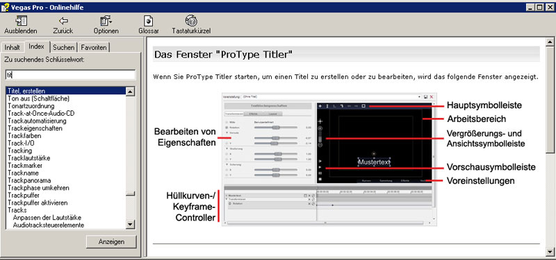 Die gedruckte Bedienungsanleitung beinhaltet auf 60 Seiten nur das Notwendigste, wer genauere Infos benötigt, findet diese in der auf der DVD mitgelieferten PDF-Datei. Dabei gilt es zu beachten, dass die deutsche Version nur magere 82 Seiten hat und der Kurzanleitung entspricht, während die englische Fassung mit stattlichen 430 Seiten relativ ausführlich ist. Es könnte sich also lohnen, beide Versionen von der DVD auf den Rechner zu kopieren. Wer im PDF-Dokument eine Beschreibung des neuen Pro Type Titlers sucht, findet — zumindest in der englischen Version — einen Hinweis auf die Hilfe-Datei, in der deutschen gar nichts. Einen Abschnitt, der sich nur mit den Neuerungen des Programms befasst, ist weder in der deutschen noch in der englischen Fassung zu finden. Diese Info gibt’s allerdings auch in der Hilfe-Datei.