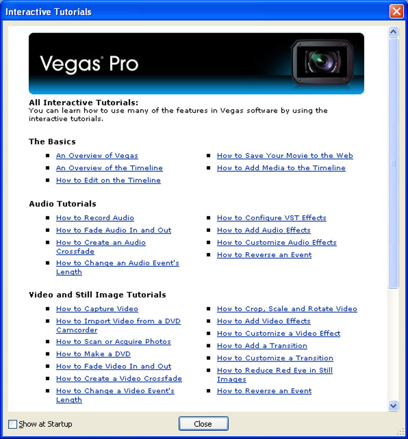 Für diejenigen, die das Programm erst kennen lernen wollen, hat Sony ein interaktives Tutorial ins Programm integriert, das den Nutzer Schritt für Schritt durch mehr als 30 Prozeduren führt. Einige davon, wie beispielsweise das Hinzufügen von Clips in die Timeline, sind so grundlegend, dass man sich fragt, ob hier nicht vielleicht doch komplett unwissenden Amateuren das Programm näher gebracht werden soll. Andere helfen, seltener genutzten Funktionen anzuwenden. Leider besteht das Tutorial auf genauer Einhaltung der Schritte, so dass ein Überspringen von eventuell schon Bekanntem nicht möglich ist.