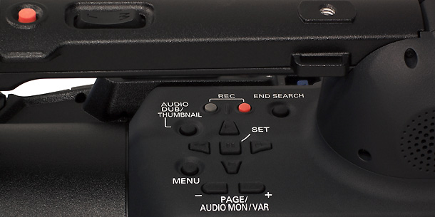 Bei Panasonics HVX200 muss man Wiedergabe und Menü unterm Haltegriff des Camcorders einstellen. Mit dieser Position der Tasten konnten sich die Tester nicht anfreunden: Die Cursor-Tasten sind zwar oben auf dem Gerät angebracht, aber wegen des Handgriffs im Praxisbetrieb oft nicht gut zu erreichen. Zudem ist ihre Beschriftung und Kennzeichnung schlecht ablesbar. Außerdem drückt man gern mal auf die falsche Cursor-Taste, wenn man auf dem seitlich ausgeklappten Schirm durch das Menü springen will: Das Tastenfeld ist gegenüber dieser zweifellos am häufigsten genutzten Schirmposition um 90 Grad verdreht.