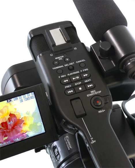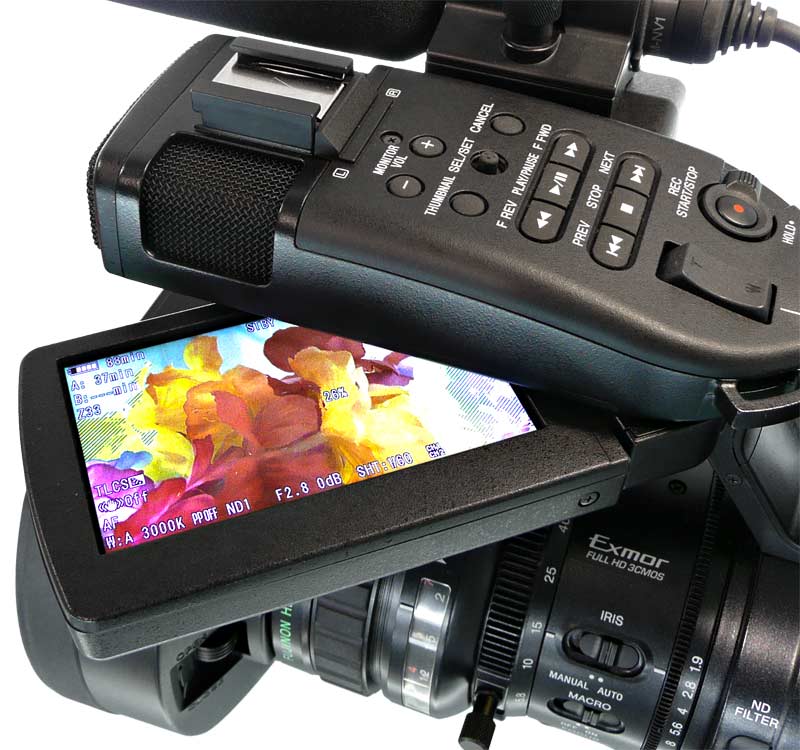 Einen Nachteil hat die Positionierung des Ausklappschirms am EX1 allerdings auch: Der Platz oberhalb des Objektivs wird dadurch eingeschränkt. Wo der HVX200 rund 4 cm Platz zwischen Objektiv und Haltegriff/Mikro bietet, sind es beim EX1 nur 2,5 cm. Beim HVX200 gibt es aber einen seitlichen Bügel, der ebenfalls störend sein kann, wenn man Objektivzubehör einsetzen will.