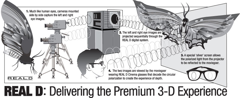Ein aktiver Polfilter vor dem Objektiv des D-Cinema-Projektors richtet die Lichtwellen der stereoskopischen Teilbilder unterschiedlich aus. Die Gläser der passiven 3D-Brille sind ebenfalls gegensätzlich polarisiert und lassen nur die Information für das jeweilige Auge passieren. Da eine mattweiße Kinobildwand die Polarisierung der Bilder aufheben würde, ist für dieses 3D-Verfahren eine Silberbildwand erforderlich.