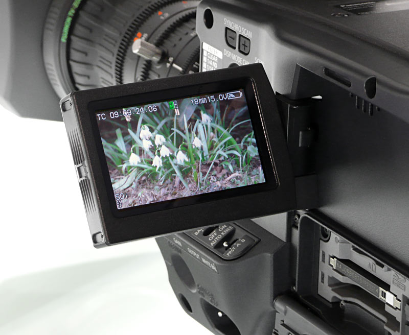 Auch beim Suchermonitor und beim Ausklappschirm geht Panasonic mit dem HPX301 neue Wege: Der Camcorder ist mit einem 16:9-Sucherfarbschirm in LCOS-Technik bestückt, der eine Diagonale von 0,45 Zoll und pro Grundfarbe (RGB) 852 x 480 Bildpunkte bietet. Insgesamt kommt man so auf 1.226.000 Bildpunkte in 16:9. Die neue Suchertechnik liefert ein ziemlich helles Bild, das für diese Preisklasse ziemlich beeindruckend ist. Beim Sucher gibt es aber auch ein paar gewöhnungsbedürftige Effekte: Wenn man blinzelt, zeigen sich im Sucher nämlich für einen kurzen Moment Farbkanten, wo diese nicht hingehören. Das wird die Arbeit in den meisten Fällen nicht beeinträchtigen, ist aber – gewöhnungsbedürftig. Unschöner ist ein anderer Aspekt: Die mechanische Konstruktion des Suchers ist so, dass es keinem der Tester gelang, das ganze Sucherbild zu sehen. Wenn man die seitlichen Bildkanten kontrollieren will, muss man dafür den Kopf etwas drehen. Dabei tritt dann aber eine Effekt auf, den man von älteren LCD-Schirmen kennt: Das Schwarz im Zentrum des Displays »kippt« schlagartig um, weil man plötzlich seitlich auf den Schirm schaut. Der neue Schirm hat also klare Vor-, aber auch Nachteile.