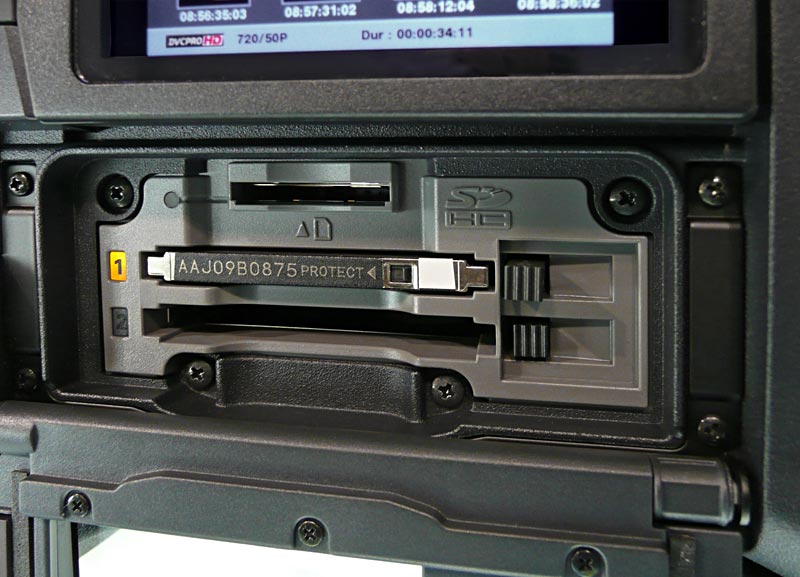 Dass es sich beim 301er um eine echte Neukonstruktion handelt, kann man unter anderem auch daran erkennen, dass die beiden P2-Karten-Slots beim AG-HPX301 auf der linken Geräteseite positioniert sind. Allerdings ist es trotz dieser an sich günstigeren Position der Slots nicht möglich, die Karten zu wechseln, wenn man den Camcorder auf der Schulter hat, denn dafür liegen die Slots zu weit hinten, im Halsbereich des Operators.
