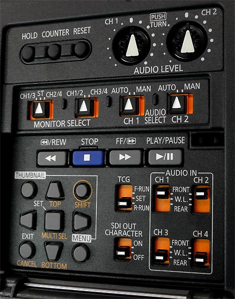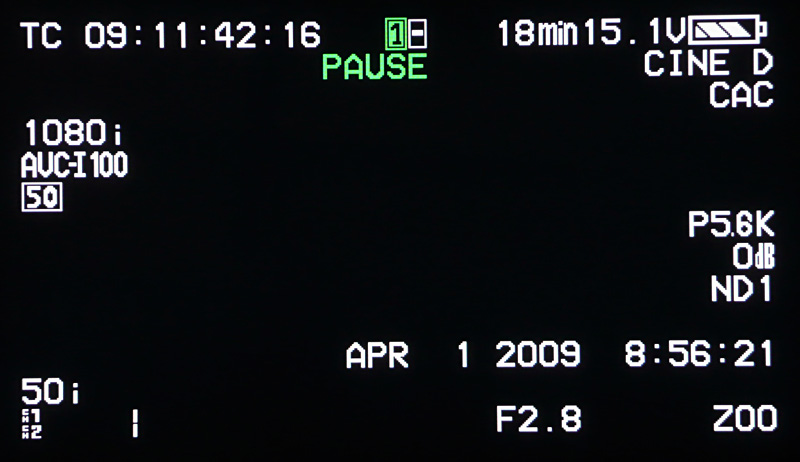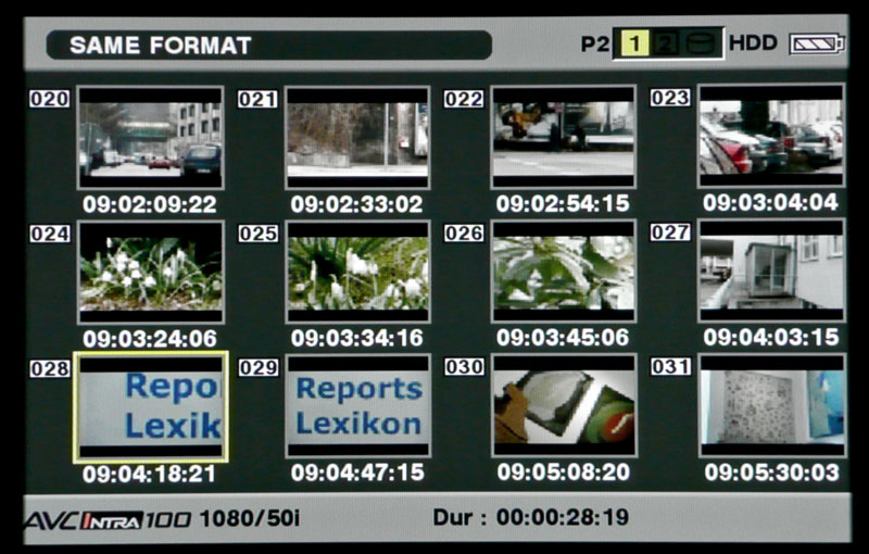 Apropos Einblendungen: Der HPX301 kann Menüs und auch Sucheranzeigen auf externe Monitore ausgeben. Beim SDI-Ausgangssignal geht das über einen Schalter, am Video-Out (Composite) über eine Menüeinstellung. Weshalb es diesen Unterschied geben muss, wissen nur die Entwicklungsingenieure. Was der Camcorder nicht ausgeben kann, sind die Suchermarkierungen, der Fokus-Bar und die Waveform/Vektorskop-Darstellung. Die Thumbnail-Darstellung im Wiedergabemodus kann der Camcorder im Sucher und auf dem Ausklappschirm darstellen, ausgeben kann er sie ausschließlich über die Composite-Buchse.