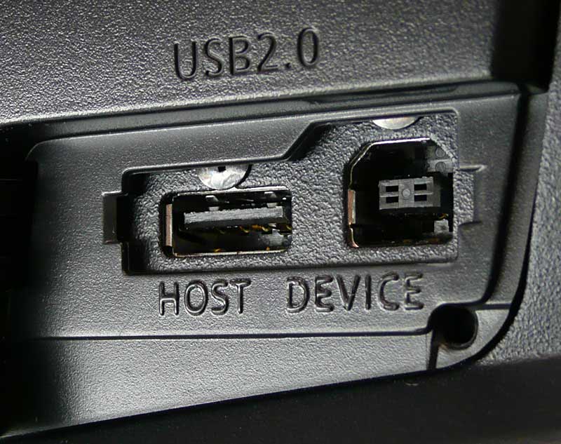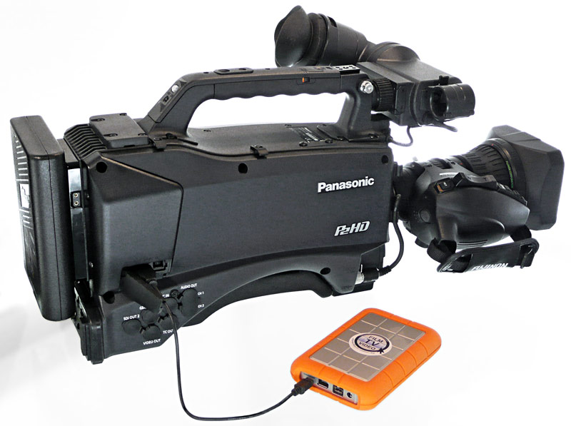 Der AG-HPX301 kann per USB mit IT-Equipment verbunden werden und lässt sich dabei — anders als andere P2-Camcorder — zwischen Host- und Device-Modus umschalten. Man kann also entweder den Camcorder wie eine externe Festplatte an einen PC anschließen, aber auch umgekehrt, ohne einen PC zu benötigen, Material direkt vom Camcorder auf andere Medien wie Speichersticks oder Festplatten kopieren. Was allerdings über den USB-Anschluss nicht funktioniert: Eine portable Festplatte als Backup-System direkt bei der Aufnahme mitlaufen zu lassen. Wer einen Harddiskrecorder für diesen Zweck anschließen will, der zusätzlich zu den P2-Karten das Material speichert, der muss dafür die AV-Anschlüsse, wie etwa die HD-SDI-Buchse nutzen.