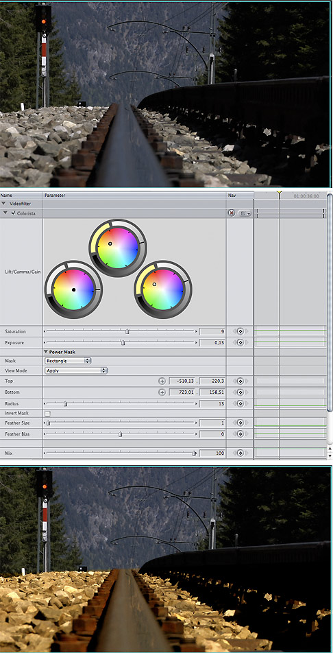 So ist Colorista letztlich gar nicht primär für die Farbkorrektur geeignet — wie es der Name suggeriert — sondern mehr für das Einstellen des Bildkontrastes und der Gamma-Kurve. Colorista ist daher eher mit einem Curve-Filter zu vergleichen, wie man sie etwa im Media Composer von Avid oder in After Effects findet. Die Handhabung ist dabei zwar schneller als bei den klassischen Curves, dafür aber auch nicht so exakt und umfangreich.