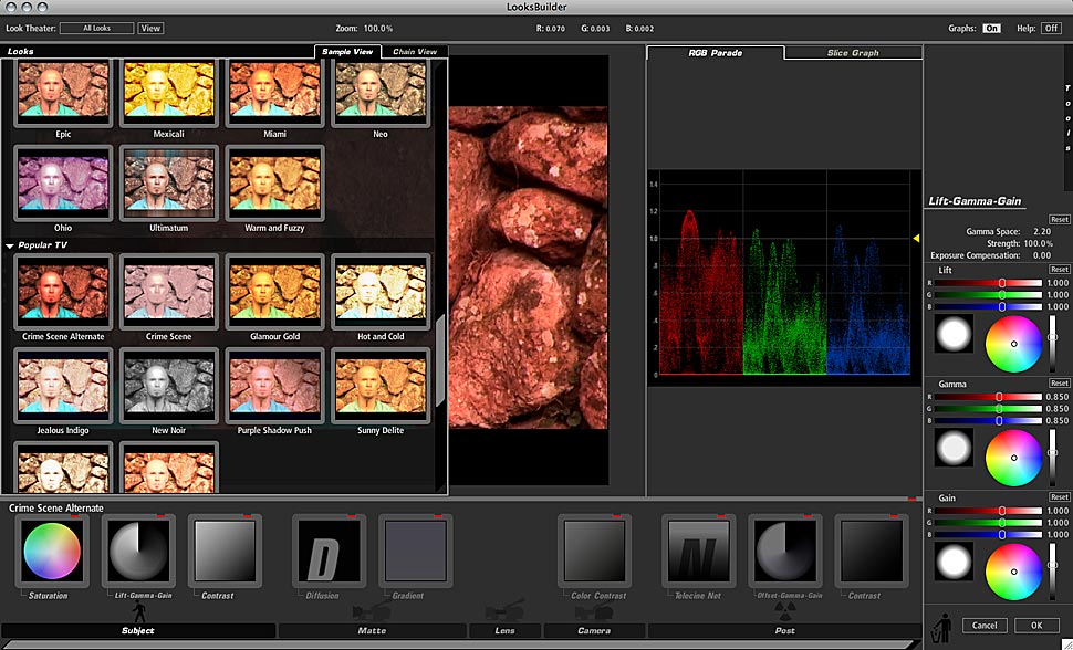 Look und Feel der Oberfläche erinnern von der Gestaltung entfernt an Apples Color, die Software ist aber weit einfacher zu erlernen und zu bedienen. Zunächst muss man immer einen aus den Hunderten verschiedener Look-Presets aussuchen. Diese sind sinnvoll in plakativ benannte Kategorien eingeteilt, ein Thumbnail gibt einen ersten Eindruck, wie sich der Look auf das Bild auswirkt. Klickt man auf einen Look, wird dieser sofort geladen und angewendet. Unter der Vorschau stehen dann die Effekte, eingeteilt in fünf Kategorien: »Subject« erlaubt es beispielsweise, nachträglich Spotllights zu setzen, »Matte« simuliert klassische Kamerafilter, »Lens« fügt Objektiveffekte zu, »Camera« erlaubt es Kameraeinstellungen nachträglich zu simulieren und »Post« gibt Zugriff auf gängige Postproduktionsfilter.