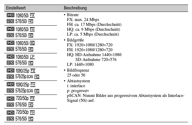 Für die SD-Aufzeichnung lässt sich der Camcorder im Menü umstellen, er nimmt dann in der hierzulande von Sony vertriebenen E-Version des Geräts, mit 576 Zeilen auf, als Bildrate sind dann 50i / 25p wählbar.