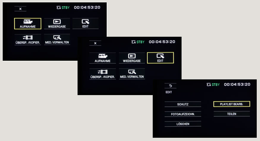 Ein Besonderheit des NXCAM-Camcorders ist die Touch-Screen-Funktionalität, die Sony integriert hat. Darüber lässt sich das »normale« Menü aufrufen und bedienen, es gibt aber auch eine Anzeige mit weiteren Modi, etwa fürs Kopieren und Editieren der aufgezeichneten Clips, fürs Grabben von Einzelbildern oder auch fürs Erstellen einer Playlist.