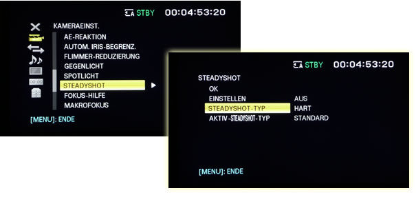 Die Steadyshot-Funktion hat Sony beim NX5 erweitert: Nach wie vor gibt es die »normale« optische Bildberuhigung Steadyshot. Zusätzlich bietet der NX5 aber auch die Variante Active Steadyshot an, die für noch stärkere Bildberuhigung sorgen soll. Der »normale« Steadyshot lässt sich in unterschiedlich intensiven Stufen zuschalten. Zur Auswahl stehen »Hard«, »Standard« und »Soft«. Die Bedienungsanleitung warnt davor, bei Schwenks den »Hard«-Modus einzustellen — zu Recht, wie sich im Test zeigt, denn mit dieser Funktion geraten die Schwenks sehr unscharf und schwammig. Auch der »Active Steadyshot« sollte eher vorsichtig eingesetzt werden, denn zum einen leidet darunter die Auflösung, zum anderen verliert man einen Tick an Weitwinkelwirkung, weil elektronisch ins Bild gezoomt und dieser Puffer zusätzlich für die Bildstabilisierung genutzt wird.