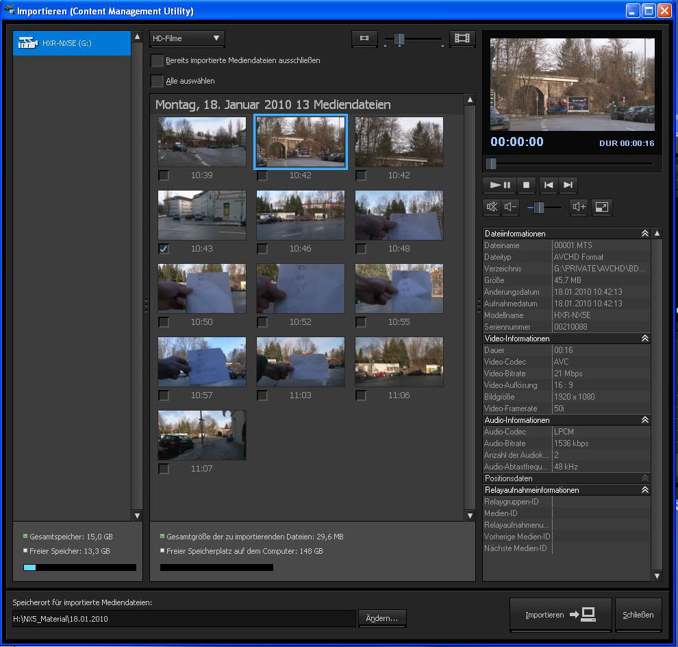 Für den reinen Datentransfer vom Camcorder auf den Rechner liefert Sony zusätzlich eine Übertragungs-Software aus, die dem XDCAM-Transfertool ähnelt. Mit der Software »Content Manager Utility« lassen sich die Daten des Camcorders sichten und auf Wunsch per USB auf den Rechner übertragen. Dabei werden die Aufzeichnungsdetails in einer Datenbank archiviert. Das ist recht komfortabel, es ist allerdings nicht möglich, die Daten zu loggen und nur bestimmte Passagen des Materials auch tatsächlich auf den Rechner zu übertragen.