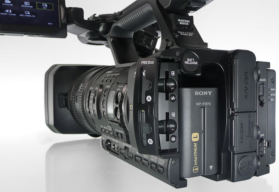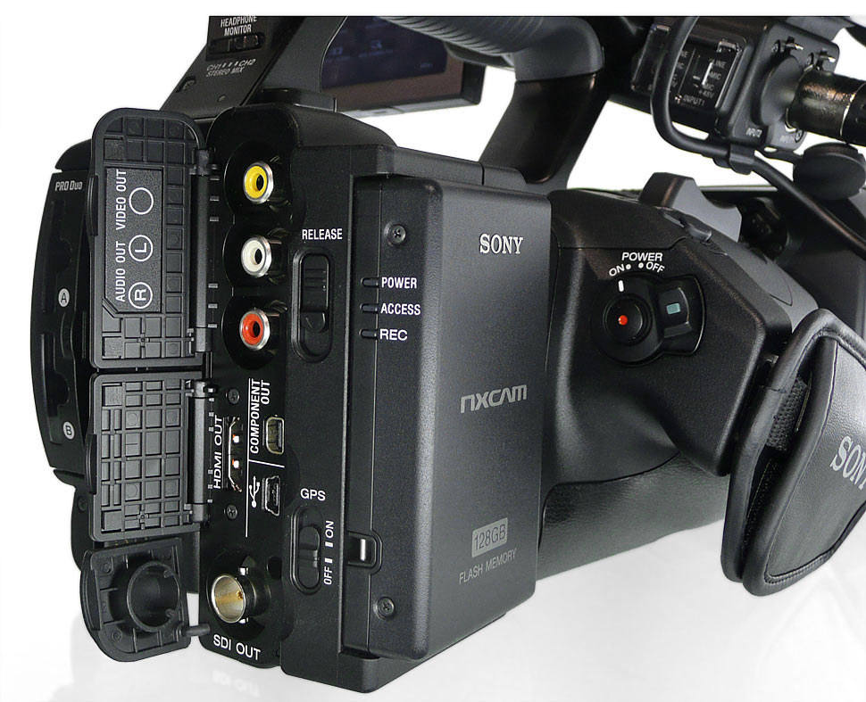 Der NX5 orientiert sich bei der Ausstattung zwar am Z5, aber bei den Anschlüssen ist er etwas besser bestückt: Neben dem HD-SDI-Ausgang bietet er auch einen HDMI-Ausgang, einen Komponenten-Ausgang, sowie analoge I/Os für Bild und Ton (FBAS) und einen USB-Ausgang. Auf eine S-Video-Buchse hat Sony verzichtet. Stattdessen bietet der Camcorder audioseitig von Haus aus zwei XLR-Buchsen, über die sich externe Tonquellen einspeisen lassen. Ein Limiter ist ebenfalls integriert.