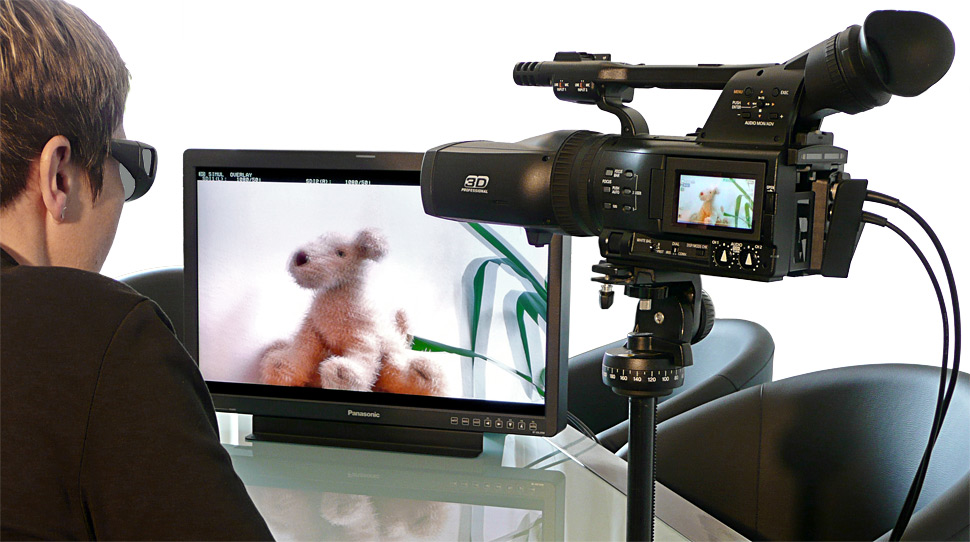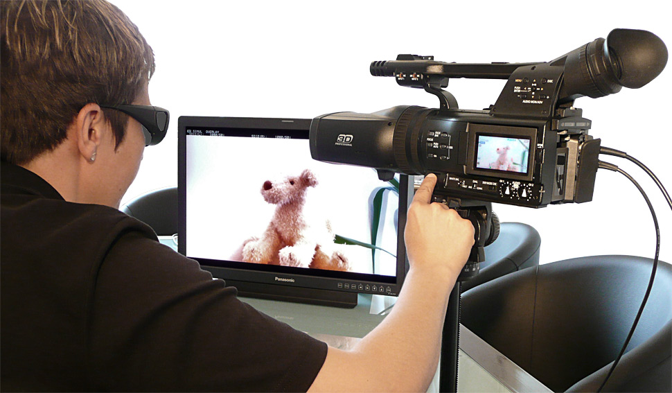 Hat man aber nach etlichem Probieren dann die passenden Einstellungen gefunden, ist es schon ein erhebendes Gefühl, die ersten eigenen Stereo-3D-Aufnahmen zu sehen. Im Test nutzte film-tv-video.de hierfür den Monitor BT-3DL2550 (Nettopreis: 8.600 Euro). Das ist ein Panasonic-Produktionsmonitor, der mit Polarisierung der beiden Stereobilder arbeitet. Das hat den Vorteil, dass man keine aktiven LCD-Brillen benötigt, sondern einfache Polfilterbrillen verwenden kann. Der Nachteil besteht darin, dass man nur einen relativ kleinen Betrachtungswinkel hat, besonders in vertikaler Richtung: Der Monitor muss sich ziemlich exakt auf Augenhöhe befinden, sonst sieht man auch dort Doppelkonturen, wo keine sind.