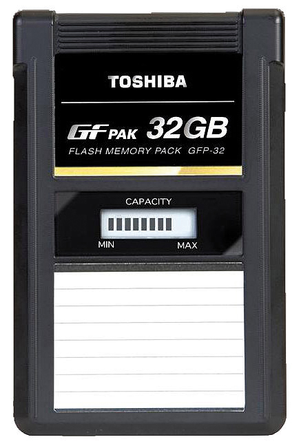 GFPak: In Form der GFPaks bietet Toshiba gemeinsam mit Ikegami eine weitere Festspeicher-Variante an. Dieses Speichermedium kommt im bandlosen Camcorder von Ikegami zum Einsatz. GFPaks sind deutlich größer als SD- oder CF-Speicherkarten, bieten aber etwa eine integrierte Kapazitätsanzeige und sind mit zwei Schnittstellen ausgestattet, die im IT-Bereich weit verbreitet sind: SATA und USB 2.0 – man benötigt also nicht unbedingt einen Reader oder einen Rechner mit speziellen Slots, um das Material kopieren und sichten zu können. Mittlerweile gibt es zwei Baureihen von GF-Paks und auch GF-Adapter, die sich mit CF- oder SD-Karten bestücken lassen.