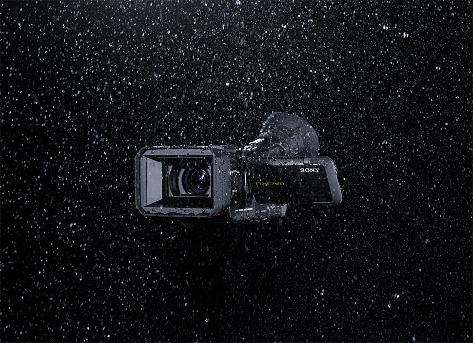 Dass Camcorder-Hersteller mit der Wetterbeständigkeit ihrer Produkte werben, kommt eher selten vor — eigentlich verwunderlich, da die Geräte ja sehr oft draußen eingesetzt werden. Mit dem HXR-NX70 ergänzt Sony seine NXCAM-Familie um einen Camcorder, der gegen Staub und Regen geschützt ist — und hebt dieses Merkmal auch besonders hervor. So wurden schon bei der Ankündigung des NX70 auf der NAB2011 dessen »Outdoor-Fähigkeiten« recht anschaulich präsentiert: Das ausgestellte Gerät wurde in einem Glaskasten unter steter Wasserberieselung gehalten und zeigte auf seinem Ausklappschirm ein Live-Videosignal.