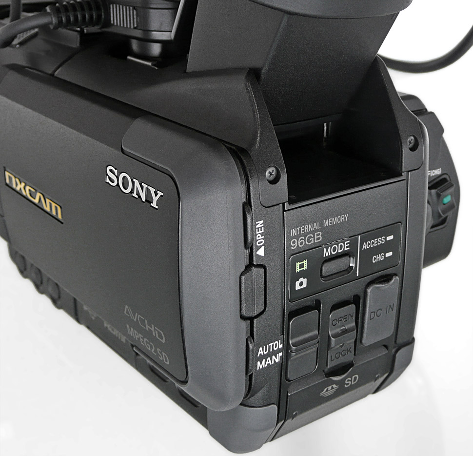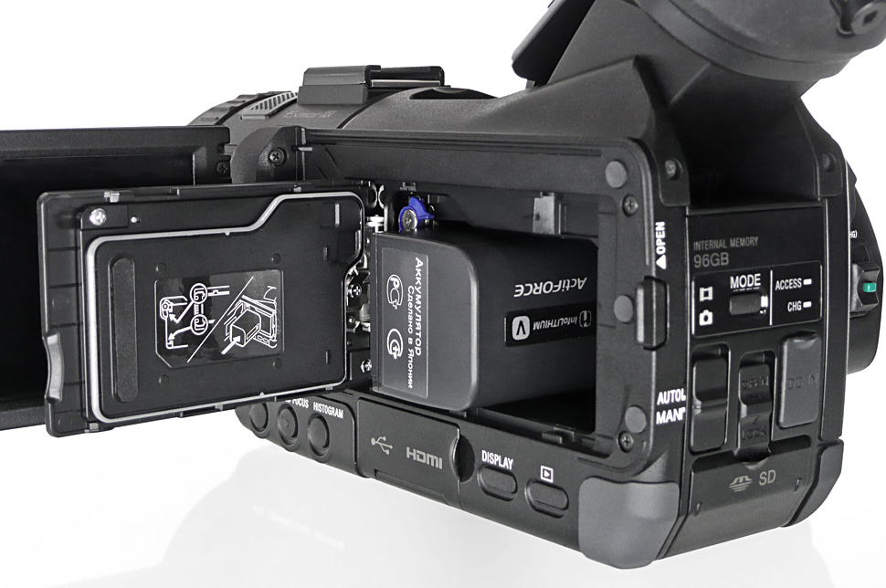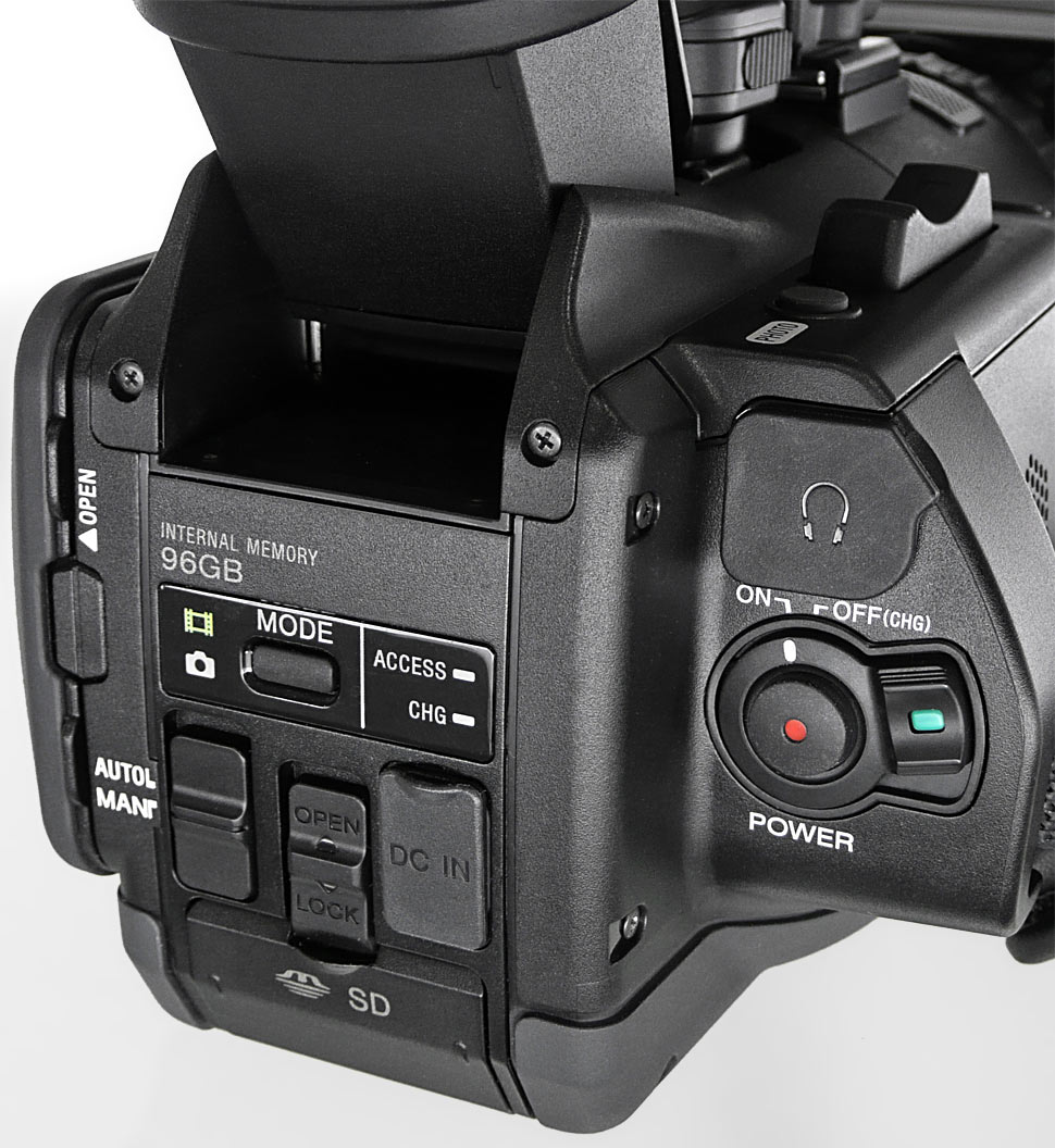 Der interne Speicher mit 96 GB reicht für rund 7,5 Stunden Aufzeichnung, wenn die höchste Qualitätsstufe des Geräts ausgewählt wurde (1080p50, PS-Mode mit 28 Mbps, Audio als PCM). In FX-Qualität passen ungefähr neun Stunden in 1080i50 auf den internen Speicher.