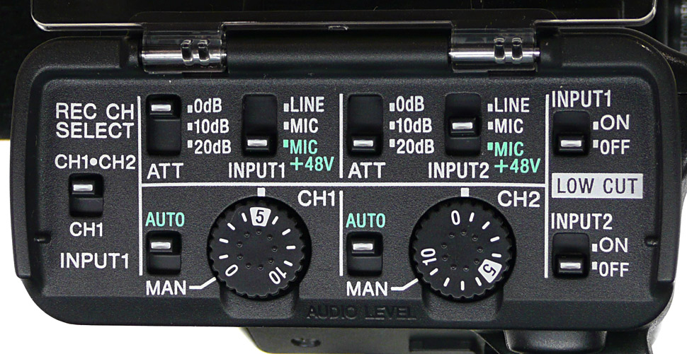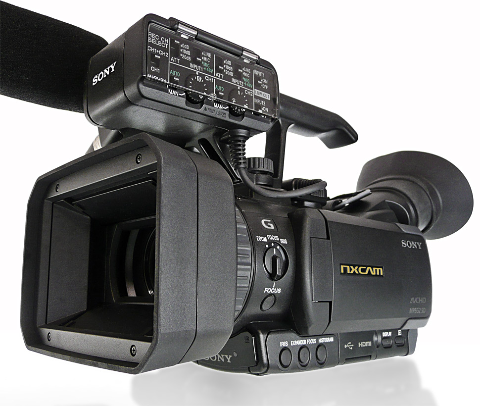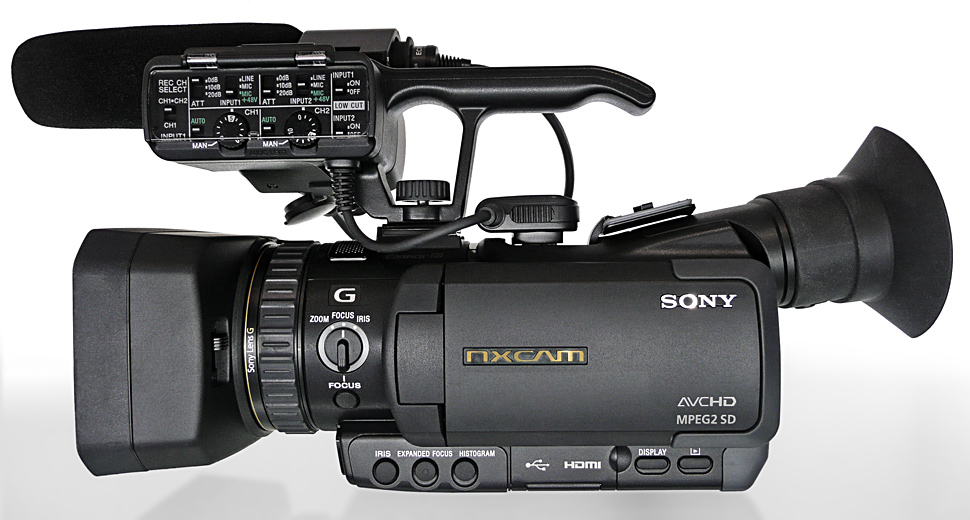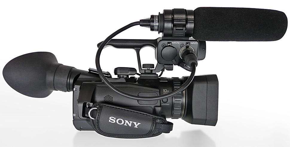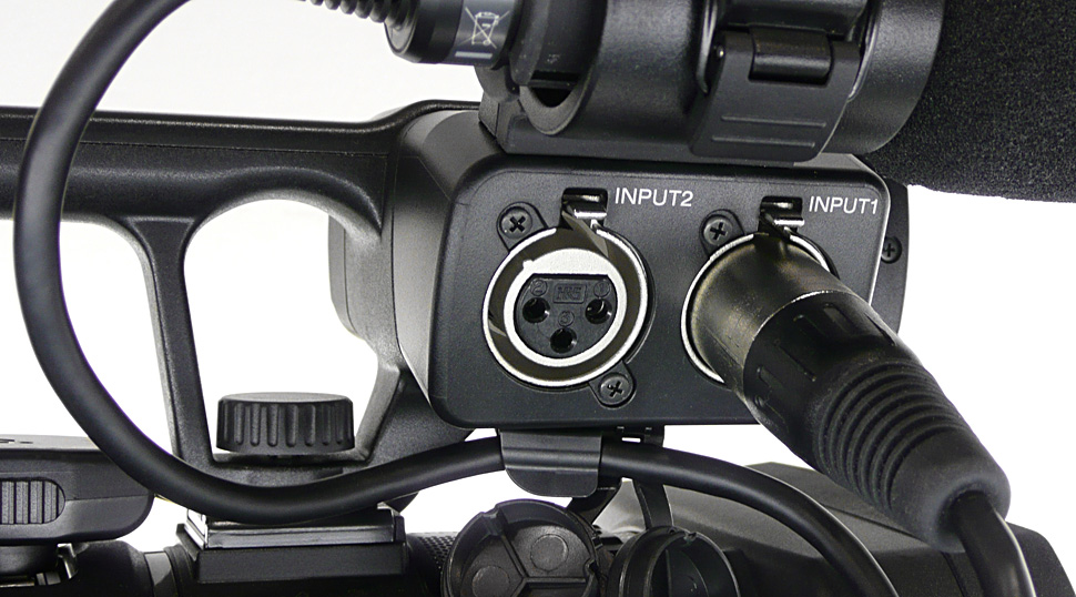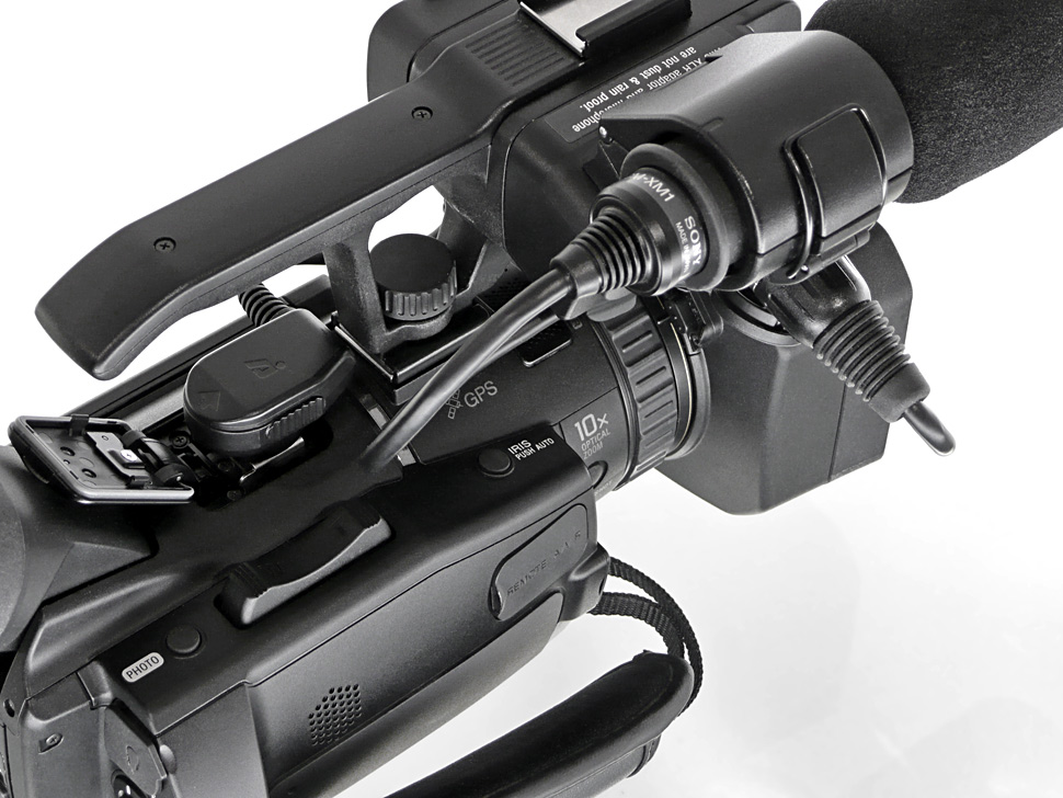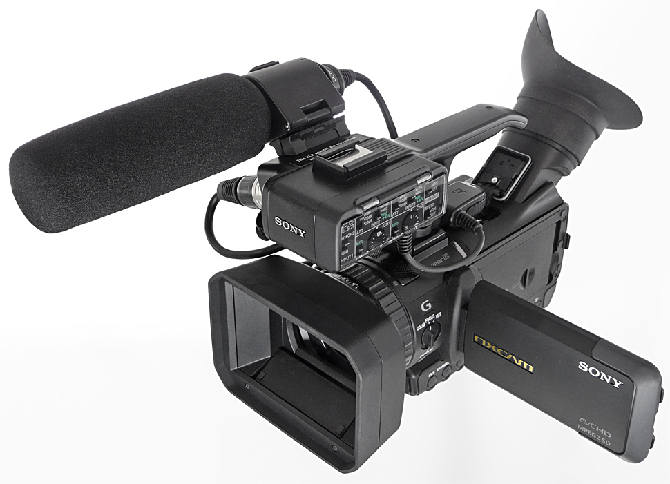 Seinen Anspruch auf professionellen Einsatz macht der NX70 — wie viele andere Camcorder im Grenzbereich zwischen Consumer- und Profibereich — durch einen Handgriff mit integrierten Audiofunktionen deutlich. Es sind zwei XLR-Anschlüsse für externes Tonequipment und die üblichen Regler zum manuellen oder automatischen Pegeln der Audiosignale integriert. Ebenfalls beigelegt ist ein passendes Richtmikrofon vom Typ Sony ECM-XM1. Der komplette Griff kann flexibel und je nach Bedarf angebracht oder entfernt werden. Die angesprochene Staub- und Regensicherheit büßt das Gerät bei Verwendung des Handgriffs jedoch ein: Sowohl die XLR-Stecker wie auch die elektrische Verbindung zwischen Griff und Camcorder sind nicht gegen Spritzwasser geschützt.