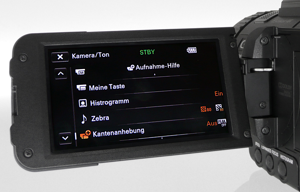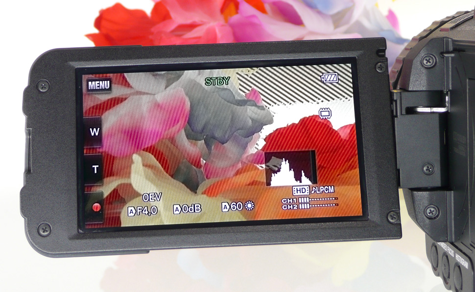 Der NX70 bietet weitere wichtige Funktionen und manuelle Verstellmöglichkeiten, die man von einem Camcorder mit professionellem Anspruch erwartet: Als Belichtungshilfe ist eine Zebrafunktion und eine Histogramm-Anzeige mit an Bord. Zur Unterstützung beim Scharfstellen wurden eine Peaking-Funktion und eine Ausschnittvergrößerung integriert, zudem wird die Fokusentfernung als Meterangabe eingeblendet. Über eine Anzeige im Display kann der Audiopegel überwacht werden.