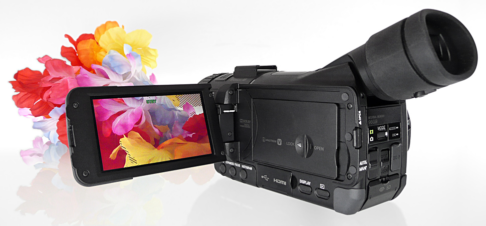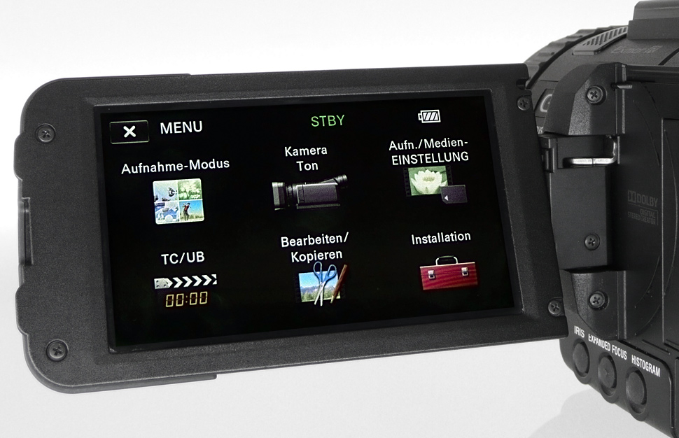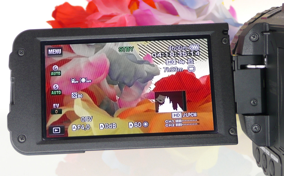 Das 16:9-Touchscreen-Display des Camcorders misst 3,5 Zoll Diagonale und bietet rund 921.000 Pixel. Der Sucher, ebenfalls in 16:9, erreicht bei einer Größe von 0,45 Zoll gut 1,2 Megapixel.