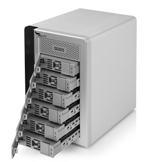 Die Pegasus-Speicher R4 und R6 von Promise sind mit einem eingebautem, hardware-basiertem RAID-Engine bestückt, der speziell für Thunderbolt optimiert ist. Die RAID-Speichersystem bieten wahlweise vier oder sechs Festplatten und kommen in der maximalen Ausbaustufe auf 12 Terabyte Speicherkapazität (Nettopreis dafür: 1.427 Euro). In dieser R6-Variante sind sechs Festplatten mit je zwei TB und 7200 U/min in einem kompakten Hardware-RAID-Gehäuse untergebracht. Sie liefern eine Übertragungsrate von mehr als 800MB/s.