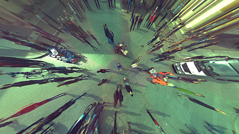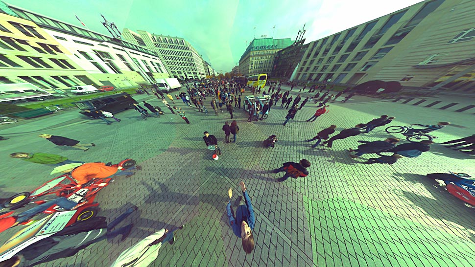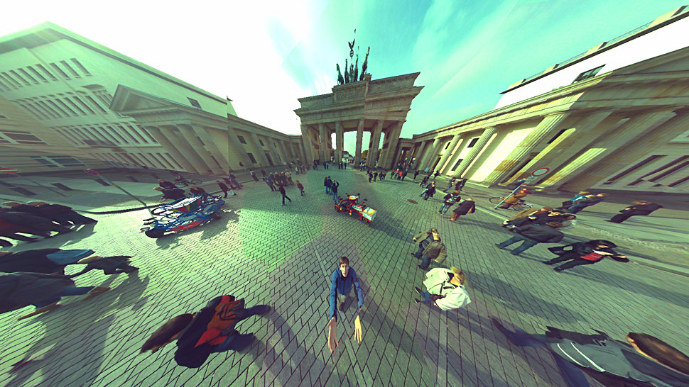 »Der Betrachter steckt quasi in der Mitte eines Kugelpanoramas und schaut sich darin um«, erläutert Jonas Pfeil. Die zweidimensionale Ebenen-Projektion am Bildschirm führt freilich — wie bei Landkarten — zu Verzerrungen. »Man kann sich das auch so vorstellen: Wenn man eine Orange schält, kann man die Schale nicht flach auslegen, ohne sie zu knautschen …«
