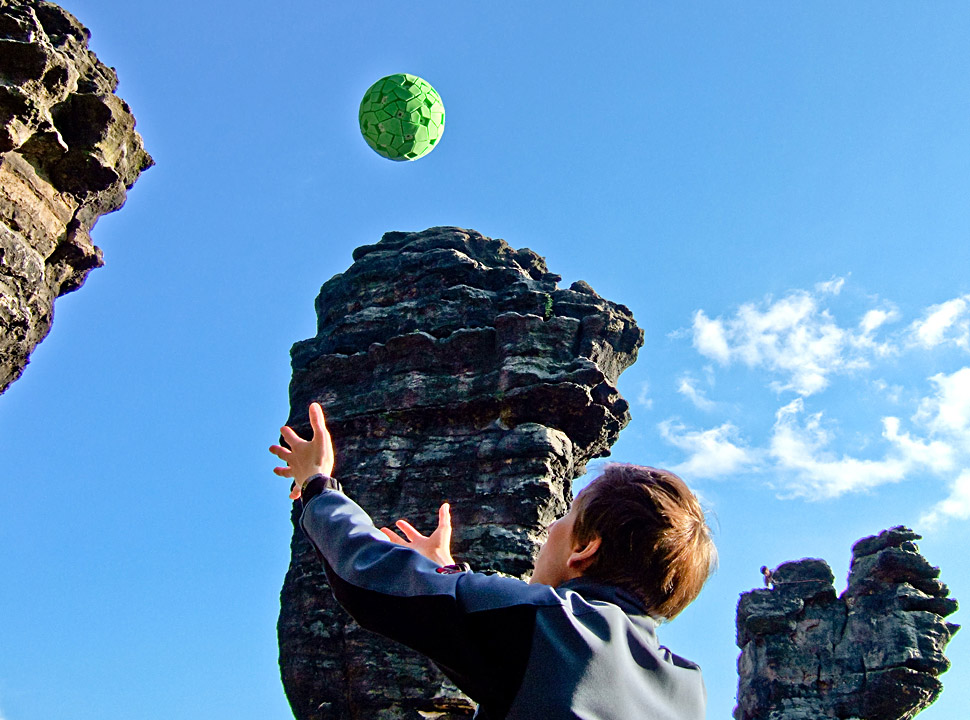Einen Blick auf die Umgebung werfen, das geht jetzt im wahren Wortsinn: Die Ballkamera wird hochgeworfen und am höchsten Punkt der Wurfbahn schießen 36 integrierte Kameras gleichzeitig jeweils ein Foto. Diese Teilbilder werden dann zu einem passgenauen Kugelpanorama zusammengesetzt. Dieses kann am Rechner angeschaut werden, ähnlich wie bei Google-Streetview.