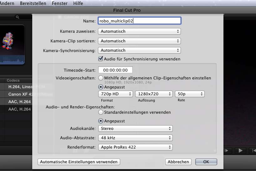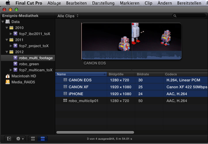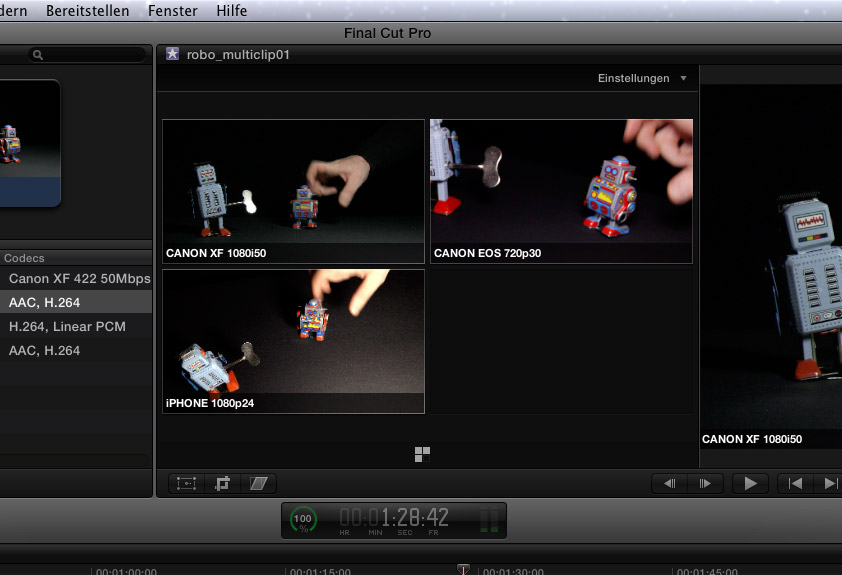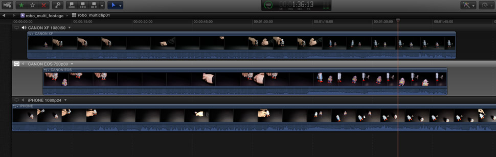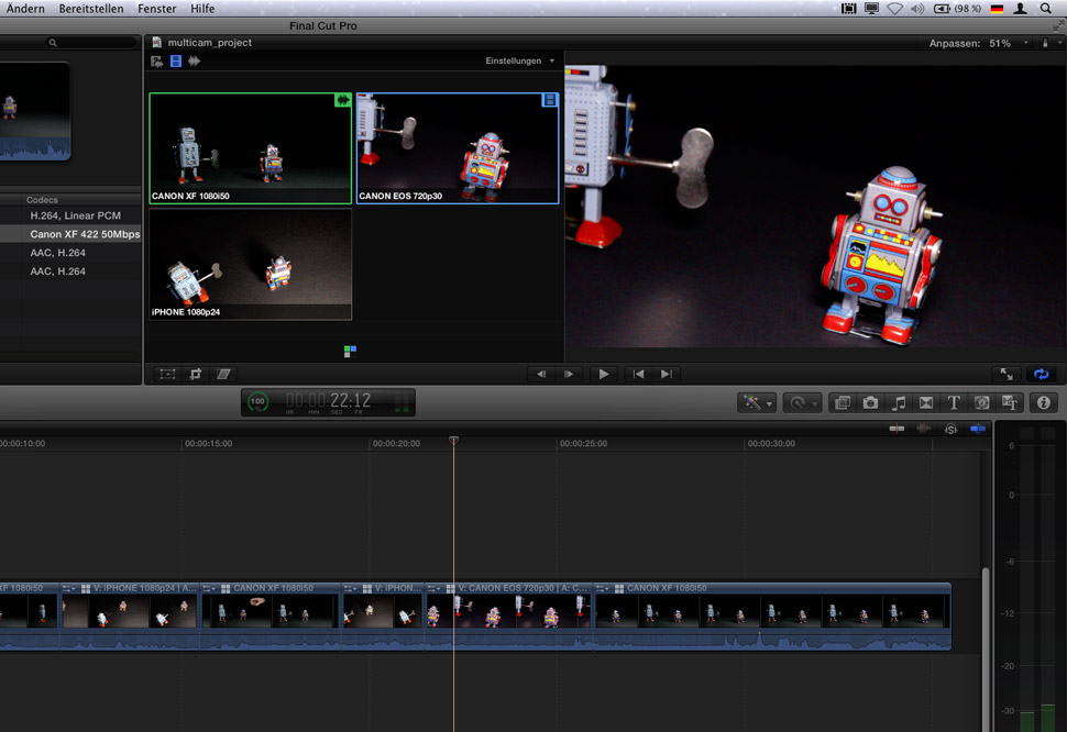 Um die Formatunabhängigkeit von Final Cut Pro X im Multicam-Betrieb zu testen, kombinierte film-tv-video.de Originalmaterial das mit unterschiedlichen Geräten in verschiedenen Codecs, Frameraten und Raster aufgenommen wurde, für die Verwendung in einem Mehrkamera-Schnitt: Neben Material aus einem Canon XF Camcorder, das mit 1080i50 bei 50 Mbps (4:2:2) im Canon XF-Codec (MXF-Container) aufgezeichnet wurde, kam Quellmaterial aus einer DSLR der Canon EOS-Baureihe zum Einsatz. Die DSLR speicherte die Videobilder in 720p30 als H.264-kodierte Datei. Zusätzlich wurde als weitere »Kamera« noch ein iPhone 4S benutzt. Dessen Videoclips lagen in 1080p24 vor, ebenfalls H.264-kodiert.