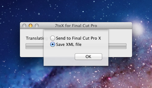 Nach dem Exportieren einer XML-Projektdatei aus FCP7 kann die 7toX-App gestartet werden. 7toX analysiert die XML-Datei und bietet an, FCPX zu starten und ein neues Final-Cut-Ereignis auf Grundlage der XML-Datei aus FCP7 anzulegen. Alternativ kann auch eine konvertierte XML-Datei gespeichert werden, die von FCPX gelesen und importiert werden kann.