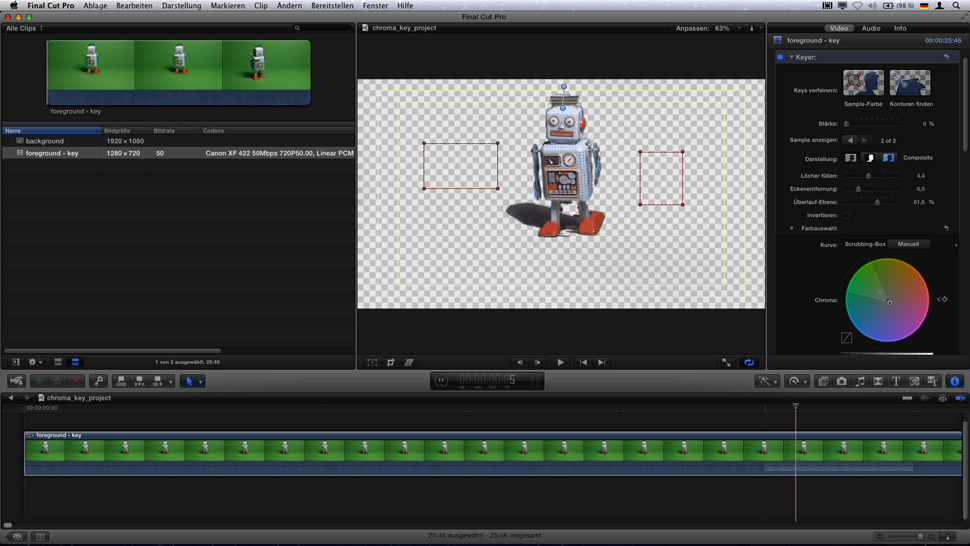 Nach dem Austesten aller Parameter, die nun in FCP X 10.0.3 zur Verfeinerung eines Chromakeys zur Verfügung stehen, kamen die Tester zu folgendem Ergebnis: Noch immer sind die wichtigsten Optionen zur Verbesserung eines Keys in FCPX die Punkte »Sample Farbe« und »Konturen finden«. Auch eine ausgewogene Einstellung der weiteren Optionen, die bereits vor dem Update enthalten waren (»Löcher füllen« und »Eckenentfernung«), kann das Keying-Ergebnis schon wesentlich aufwerten.