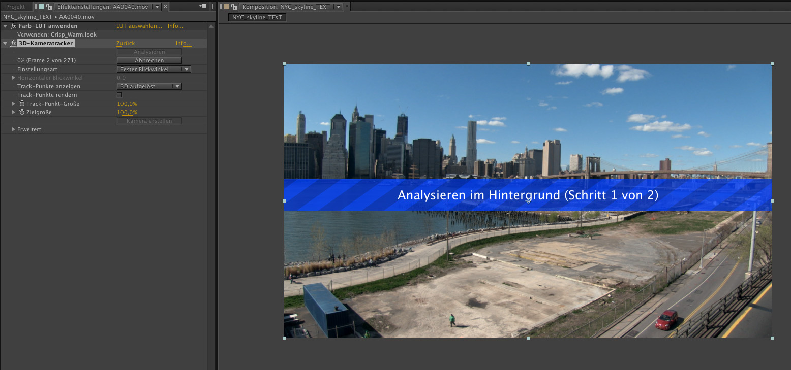 Ebenfalls aufhorchen lässt die Integration eines 3D-Kameratrackers in After Effects CS6. Kameratracking oder auch Matchmoving bezeichnet einen Vorgang, bei dem sich Kamerabewegungen und Zoomfahrten, die mit der Kamera während einer Aufnahme durchgeführt wurden, nachträglich per Software erfassen lassen. Mit Hilfe eines Kameratrackers kann real gedrehtes Material mit künstlich erzeugten 3D-Objekten kombiniert werden, wobei sich die 3D-Objekte bei einer Kamerabewegung oder einem Zoom dann genau so verhalten, wie die realen Objekte der Szene.