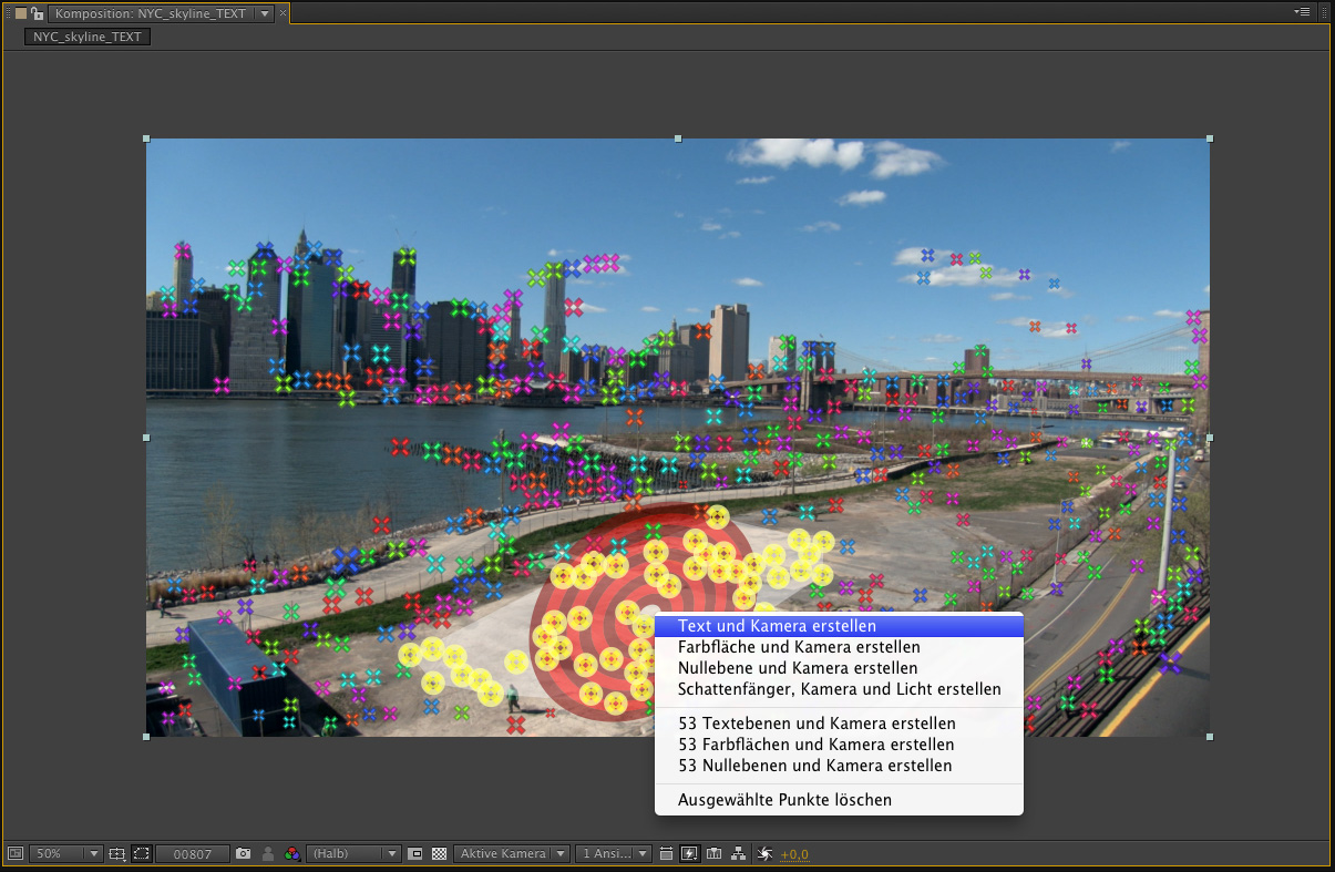 Auch der 3D-Kameratracker in After Effects funktioniert nach dem beschriebenen Prinzip. Durch die direkte Integration in After Effects lassen sich Objekte nach der Analyse der Tracking-Punkte wesentlich leichter in den 3D-Raum platzieren, als dies mit den externen Varianten möglich ist. So werden in After Effects einige Punkte ausgewählt, die auf der Ebene liegen, auf der sich später das grafische Element befinden soll. In einer Vorschau wird bereits bei der manuellen Auswahl der Punkte eine Zielscheibe in der entsprechenden Perspektive auf dem eigentlichen Bild überlagert. Der Anwender kann so schnell beurteilen, ob die angewählten Punkte eine perspektivisch korrekte Darstellung liefern. Per Rechtsklick lässt sich dann beispielsweise ein Null-Objekt erzeugen, das an der ausgewählten Ebene im 3D-Raum haftet. Mit diesem Null-Objekt können wiederum beliebige Objekte verknüpft werden.