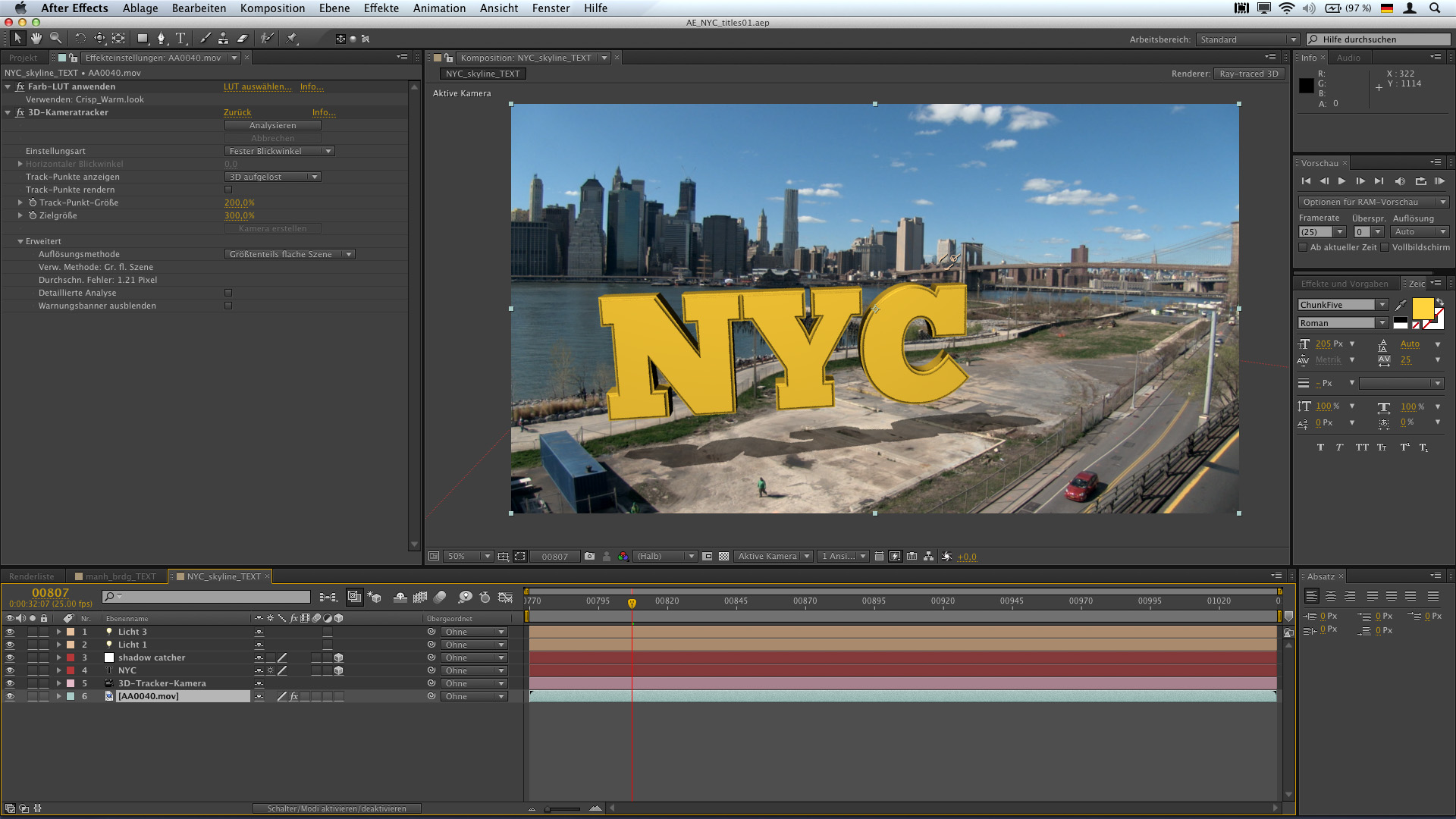 Der 3D-Kameratracker bietet vielfältige Anwendungen: In Verbindung mit dem Raytracing-3D-Renderer ist es möglich, aufgrund der virtuellen Kamera einen 3D-Text im Bild zu integrieren. Durch die Bewegung der 3D-Kamera wirkt dieser Text dann so, als würde er tatsächlich im Motiv stehen. Für einen realistischeren Gesamteindruck kann in diesem Fall auch ein »Shadow and Light Catcher« erzeugt werden. Das ist eine spezielle Ebene, die in den Raum gelegt wird und lediglich zur Schattenwiedergabe dient. Dabei müssen die 3D-Textebene und die zugehörige Schattenebene unter Umständen manuell aneinander angepasst werden, um eine realistische Wiedergabe zu erreichen. Natürlich lassen sich so auch 3D-Objekte oder grafische Elemente in eine Einstellung montieren, die außerhalb von After Effects erstellt wurden.