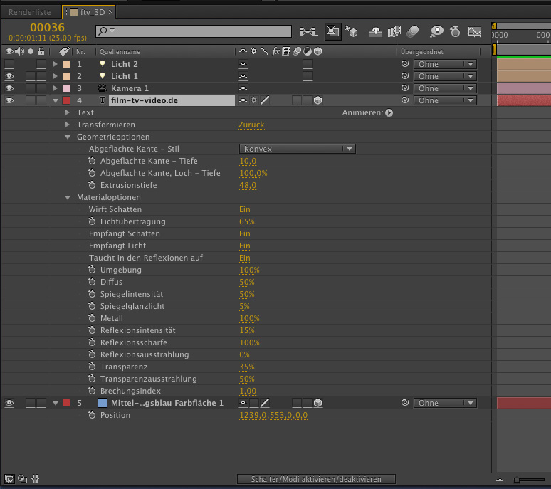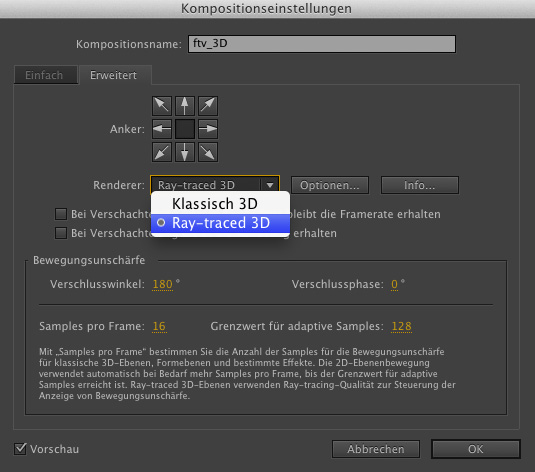 Die wohl größte Neuheit in After Effects CS6 ist der Raytracing-3D-Renderer. Das neue Render-Modul ergänzt den noch immer vorhandenen, klassischen 3D-Modus in After Effects. Der Anwender kann bei jeder Komposition aufs Neue auswählen, in welchem 3D-Modus gearbeitet werden soll, also »klassisch 3D« oder »Raytraced 3D«. Entscheidet man sich für den Raytracing-3D-Renderer, so stehen zusätzliche 3D-Funktionen zur Verfügung: Beispielsweise wird es dadurch möglich, direkt in After Effects 3D-Texte und 3D-Formen zu erstellen.
