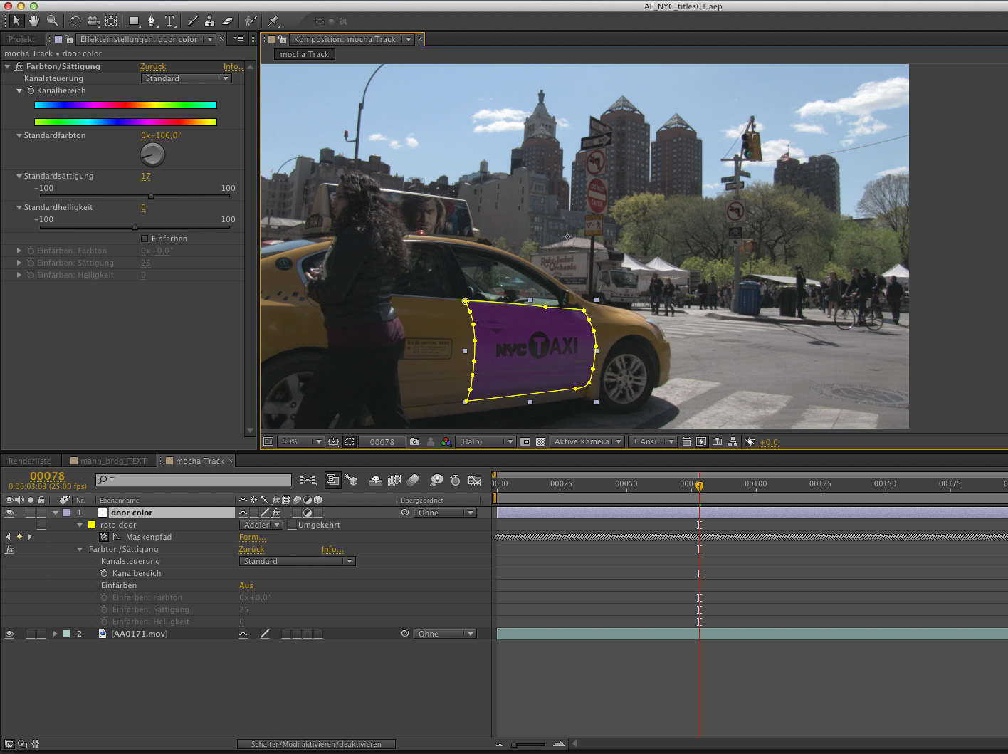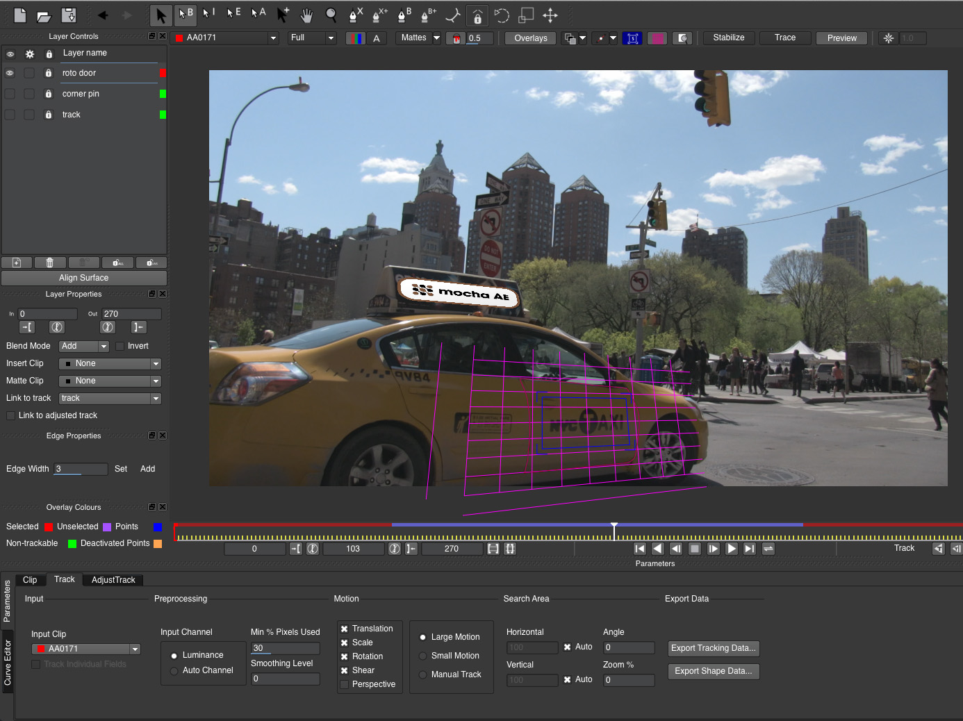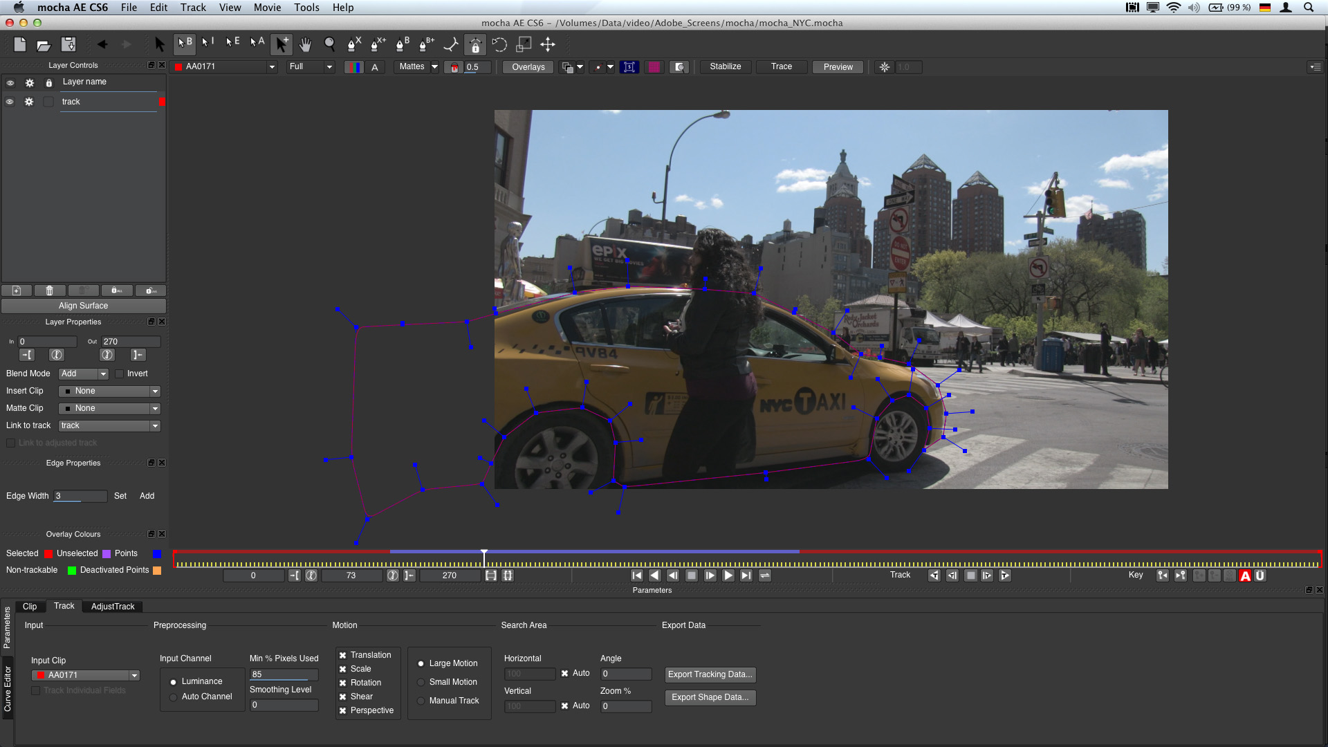 Wie schon in den beiden früheren Versionen des Production Premium-Bundles ist die Tracking / Rotoscoping-Lösung Mocha AE CS6 Bestandteil von After Effects. Bei Mocha von Imagineer Systems handelt es sich um einen Planar-Tracker. Die Software verfolgt also Ebenen und Flächen und nicht einzelne Punkte. Hierdurch können zum Beispiel Objekte mit Bewegungsunschärfe oder wechselnder Beleuchtung besser verfolgt werden. Auch wenn sich Teile des zu trackenden Objektes aus dem Bild bewegen, kann Mocha noch einen brauchbaren Track erstellen. Die mit Mocha gewonnenen Tracking-Daten lassen sich beispielsweise auf einen Text oder eine beliebige andere Ebene in After Effects übertragen. Mocha liefert in vielen Fällen bessere, schnellere und zuverlässigere Tracking-Ergebnisse, als dies mit dem in After Effects integrierten Punkt-Tracker möglich wäre. Zudem ist die Bedienung relativ schnell erlernbar und man kommt auch als weniger erfahrener Motion-Tracker schnell zu einem befriedigenden Ergebnis.