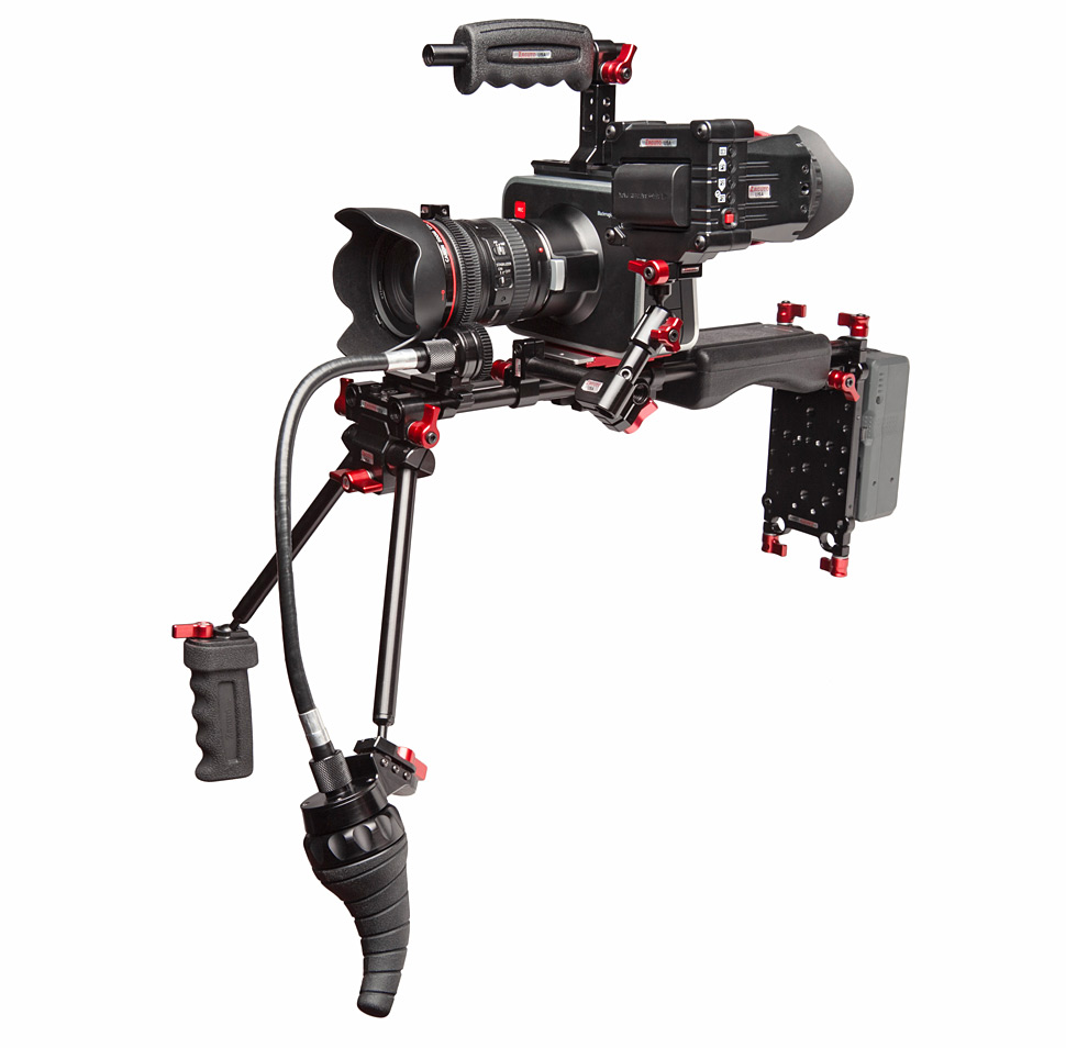 Stinger ist ein Schulterrig, das auf dem TripodRig basiert, zusätzlich aber eine Schulterstütze sowie komfortable Haltegriffe bietet. Als Ergänzung bietet sich bei diesem Setup ein elektronischer Viewfinder an.