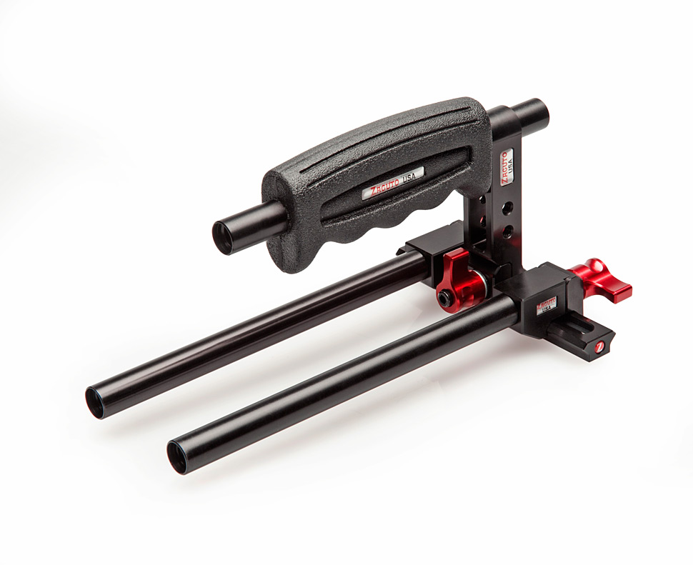 Das Ultralite-Rig wurde speziell für die Blackmagic-Kamera entwickelt. Es ist sehr leicht und in der Grundausstattung mit Top-Haltegriff und einem Set von 15mm-Stangen zu haben. Der Haltegriff lässt sich ausbalancieren, und an den Stangen lässt sich weiteres Zubehör montieren, etwa Lampen oder Mikrofone.