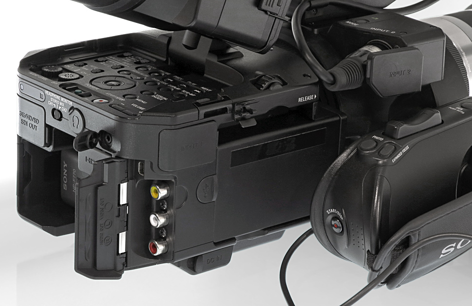 Im Gegensatz zum FS100 spendierte Sony dem FS700 neben einem HDMI-Ausgang (8 Bit, 4:2:2 inklusive Timecode) auch eine BNC-Buchse, die per 3G-HD-SDI die unkomprimierten HD-Signale ausgibt. Ein Firmware-Update soll es laut Sony ermöglichen, über diesen HD-SDI-Ausgang auch Signale mit 4K-Auflösung auszugeben und mit einem geeigneten Recorder aufzunehmen. Momentan ist die Ausgabe aber noch auf die üblichen HD-Auflösungen beschränkt. Zudem können Videosignale auch über einen Standard-Cinch-Anschluss oder über Component-Out ausgegeben werden.