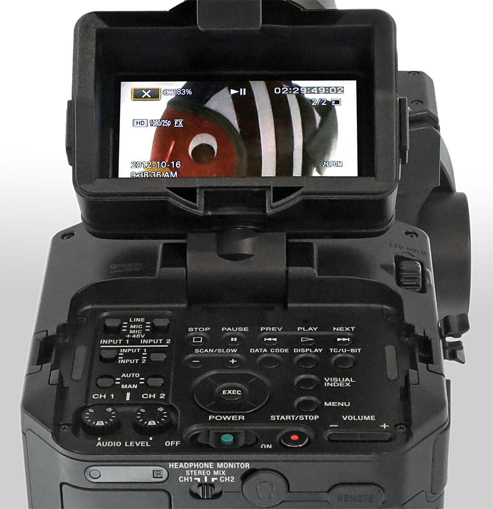 Wie bereits angeklungen, ist die Display-Position im hinteren Camcorder-Bereich hinderlich, wenn das Gerät beim Handheld-Betrieb auf der Schulter abgestützt werden soll. Ein im vorderen Gehäusebereich angebrachtes Display, wie zum Beispiel bei Sonys PMW-200 (Info), HXR-NX5 (Test) oder auch PMW-EX1 (Vergleichstest), würde hier ergonomische Vorteile bieten. Und während die Display-Position für Aufnahmen aus der Froschperspektive noch gut geeignet ist, ist das Display in Situationen, in denen der Camcorder über dem Kopf gehalten wird, völlig nutzlos.