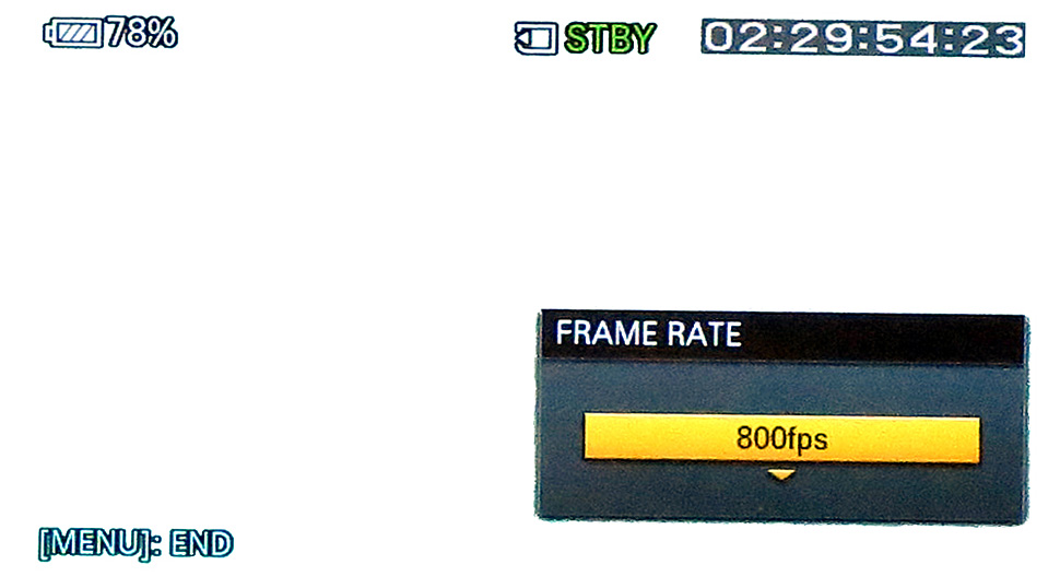 Das herausragende Merkmal des NEX-FS700 ist seine Slow-Motion-Funktionalität. Je nach Betriebsart (50 oder 60 Hz), sind Aufnahmen mit bis zu 240 fps in voller 1080p-Auflösung möglich. Generell stellt der FS700 im Super-Slomo-Betrieb nur die Aufzeichnung in einem progressiven 1.920 x 1.080-Raster bereit. Bei 50 Hz-Betrieb sind dies 1080p50 oder 1080p25, bei 60 Hz-Betrieb 1080p60, 1080p30 und 1080p24. Andere HD-Auflösungen und Bildraten, wie beispielsweise 720p50, stehen nicht zur Auswahl. Aktivieren lässt sich Slow Motion schnell und unkompliziert über einen eigenen Button auf der Gehäuseseite. Auch über das Menü kann die Funktion ausgewählt werden.