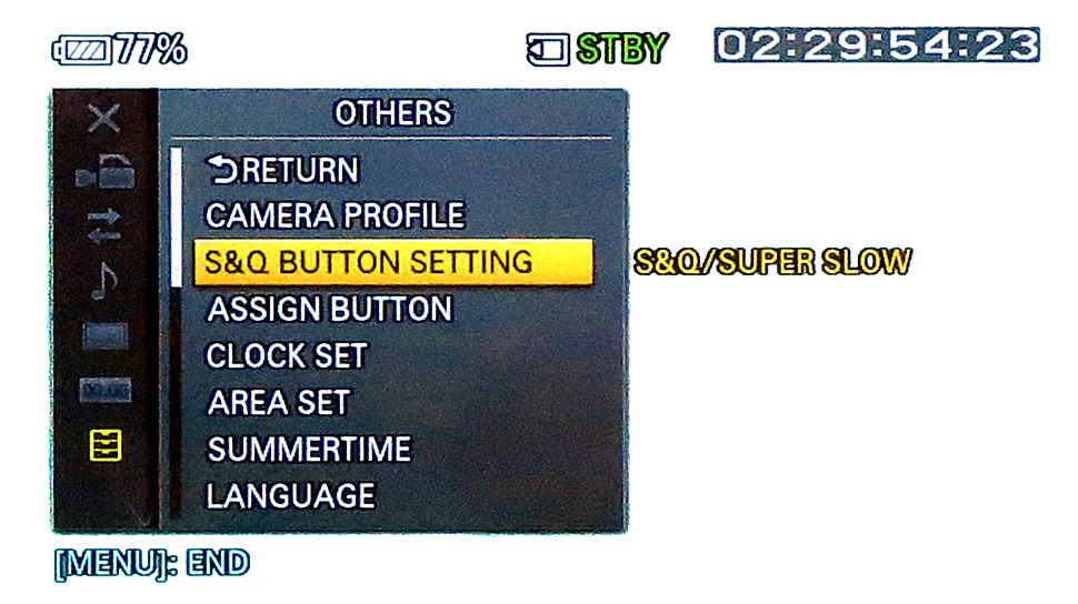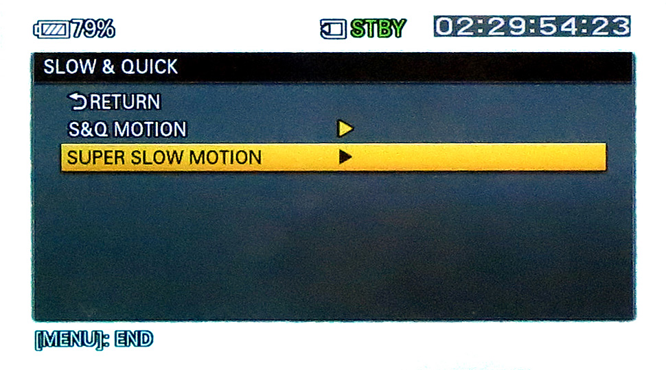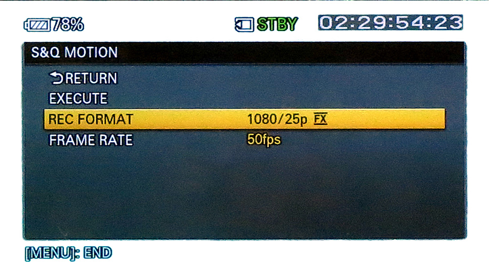 Neben der Slow-Motion-Funktion erlaubt der NEX-FS700 auch die Aufnahme in einem Slow&Quick-Modus. Dabei lassen sich Bildraten von 50, 25, 12, 6, 3, 2 oder 1 fps einstellen. Wird hier mit beispielsweise ein Motiv mit 50 fps aufgenommen und in eine Datei mit einer Wiedergabegeschwindigkeit von 25 fps abgelegt, ist eine Zeitlupe mit halber Geschwindigkeit möglich. Ansonsten ist der Slow&Quick-Modus für Zeitrafferaufnahmen, beispielsweise von einem Sonnenuntergang, das geeignete Mittel.