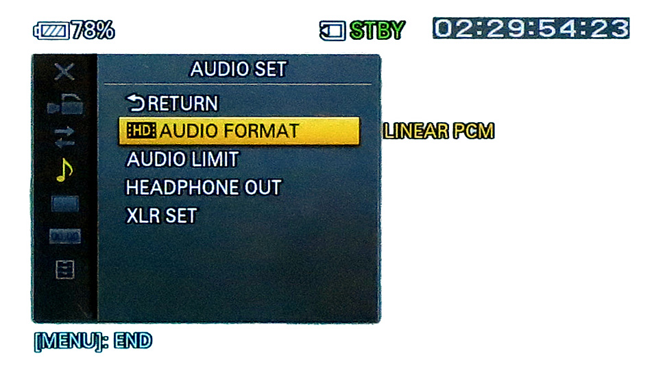 Externe Line-Audio- oder Mikrofonsignale können über zwei XLR-Buchsen an den Camcorder angeschlossen werden. Beide XLR-Audioeingänge bieten Phantomspeisung und lassen sich sowohl automatisch als auch manuell aussteuern. Der Ton wird auf maximal zwei Kanälen aufgezeichnet. Dabei kann zwischen einer Linear-PCM– oder einer Dolby-Digital-Kodierung gewählt werden. Beide Audio-Codecs arbeiten mit 16 Bit bei 48 kHz.