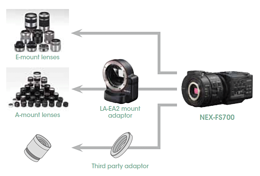 Zum Anschluss der Wechseloptik verfügt der FS700, wie auch die anderen Geräte der NEX-Baureihe, über den Sony-E-Mount. Für diesen Wechselobjektivanschluss sind etliche Adapter von Drittherstellern verfügbar, die beispielsweise auch den Anschluss von Objektiven mit PL-Mount sowie Canon- oder Nikon-Bajonett erlauben. Wird der Sony-Adapter LA-EA2 benutzt, ist es möglich, Sony-A-Mount-Optiken anzuschließen und dabei die Autofokus-Funktion dieser Optiken mit dem FS700 zu nutzen.