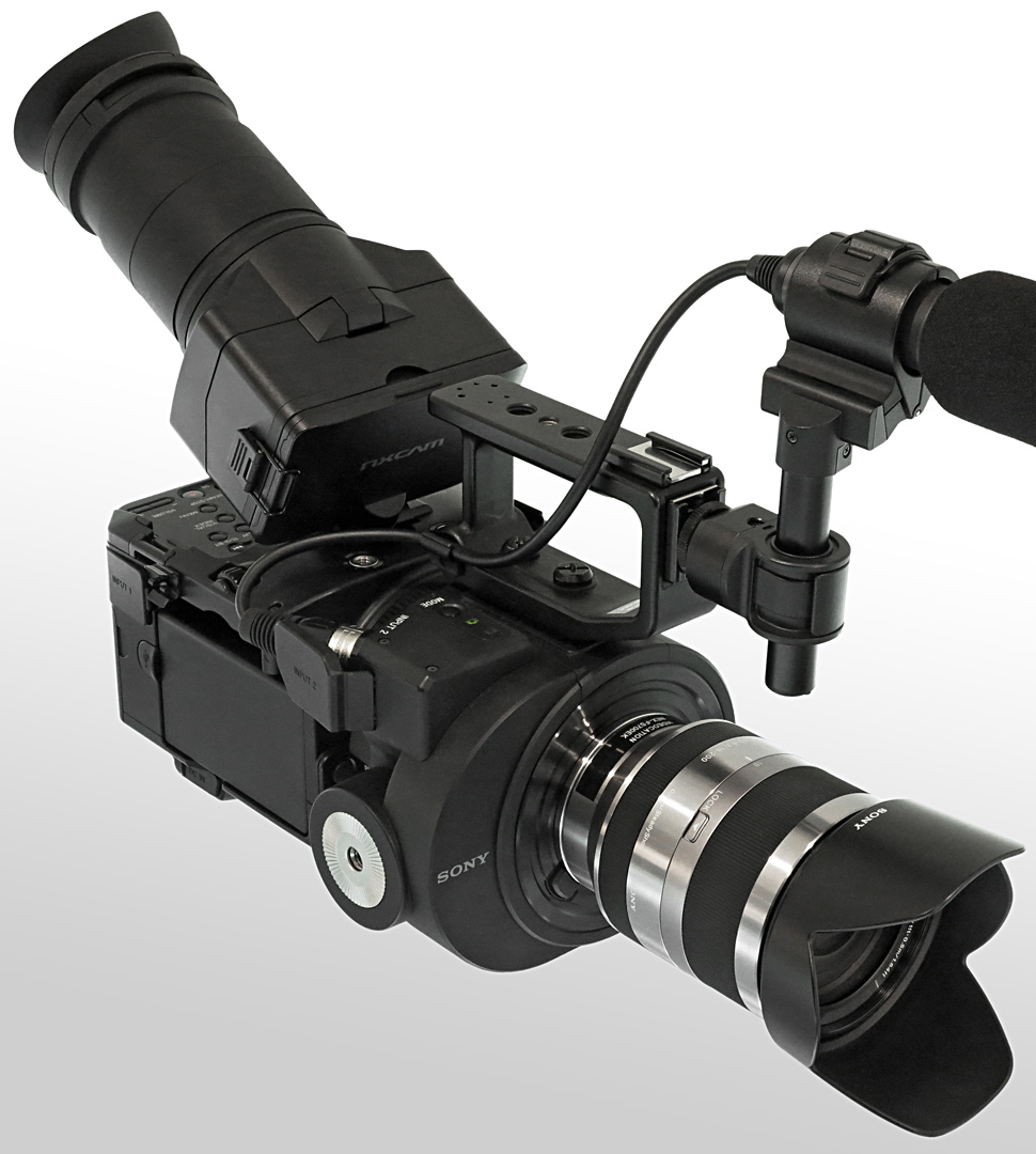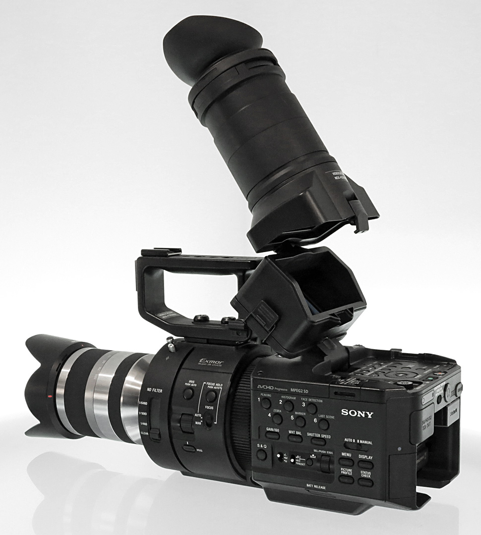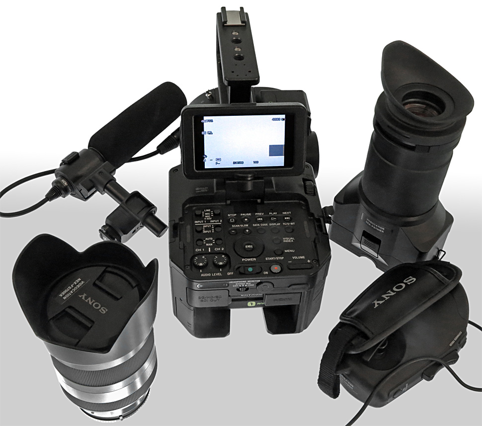 Das 3,5-Zoll-Display des FS700 verfügt über rund 921.000 Pixel. Es ist als Touchscreen ausgeführt. Durch den mitgelieferten Tubus mit Sucherlupe und Augenmuschel lässt sich das Display in einen Suchermodus umbauen. Ebenfalls im Lieferumfang enthalten: ein Handgriff, der sich seitlich am Gehäuse anschrauben lässt und den Handheld-Betrieb des FS700 ermöglichen soll. Weiter wird der Camcorder mit einem kurzen Shotgun-Mikrofon vom Typ ECM-XM1 ausgeliefert. Zur Spannungsversorgung nutzt der FS700 die standardmäßigen Sony-NP-F-Akkus. Mit Kit-Objektiv, Mikrofon und NP-F-770-Akku wiegt der NEX-FS700 gut 3 kg.