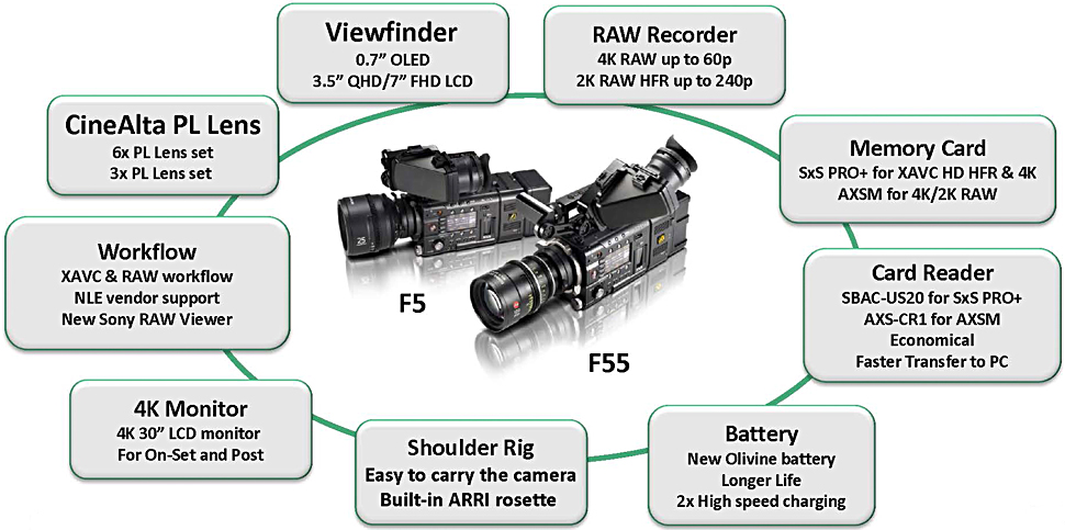Die F5 betrachtet Sony aufgrund dieser Unterschiede eher als HD-Produktionskamera, die »4K-ready« ist, also bei Bedarf mit dem Andockrecorder als 4K-Kamera genutzt werden kann. Im Unterschied dazu sieht der Hersteller die voll ausgestattete F55 als 4K-Produktionskamera, bei der die Anwender zwischen komprimierter 4K-Onboard-Aufzeichnung auf das handliche SxS-Medium und der 4K-Raw-Aufzeichnung auf dem Andockrecorder wählen können.